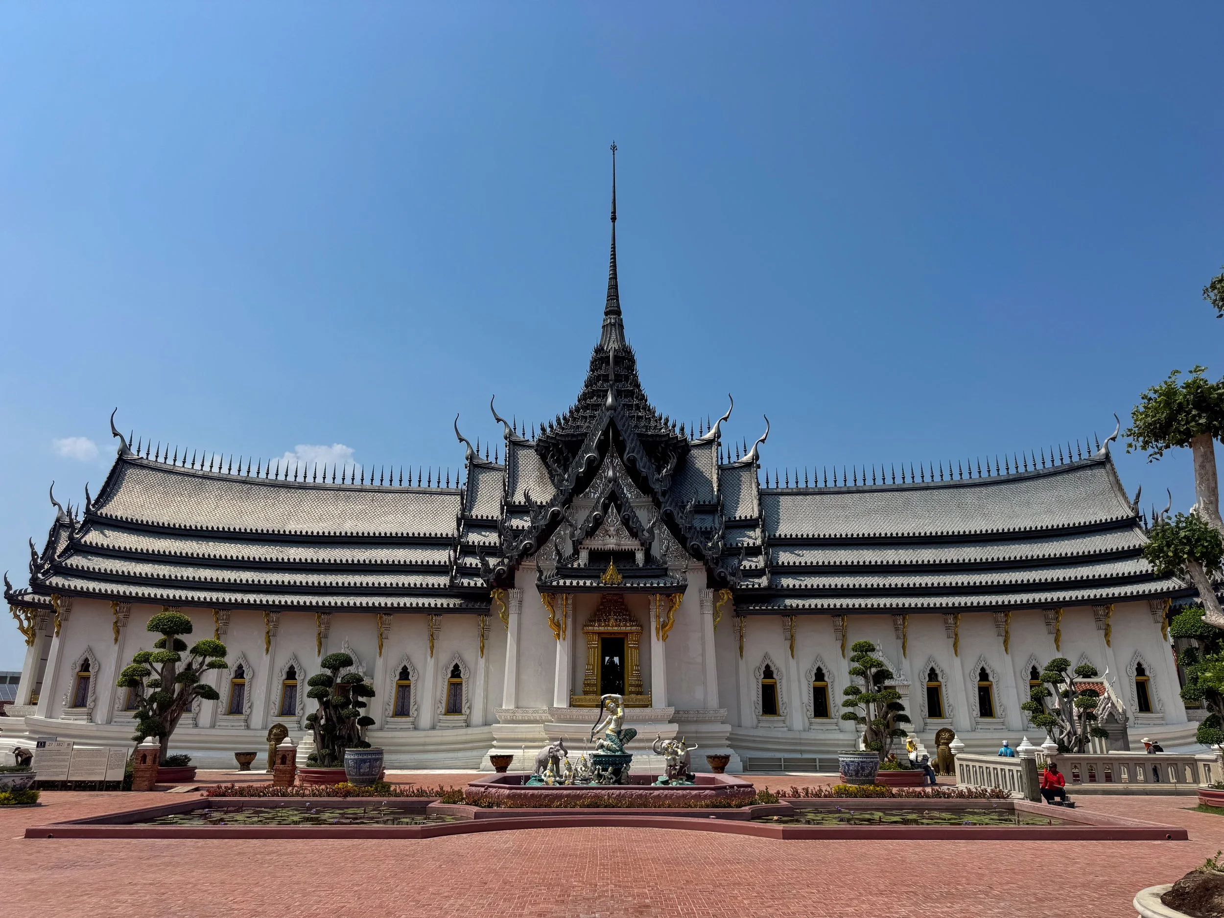 Sanphet Prasat Palace, Ayutthaya. A grand reconstruction of the Thai Imperial Palace lost to history. The large white building had a multi tiered black tiled Khmer style roof. It’s forbidden to take photos within its gilded interior displaying royal statues and garments. The surrounding grounds are landscaped with lily ponds, small streams, sculpted trees and elephant shaped fountains.