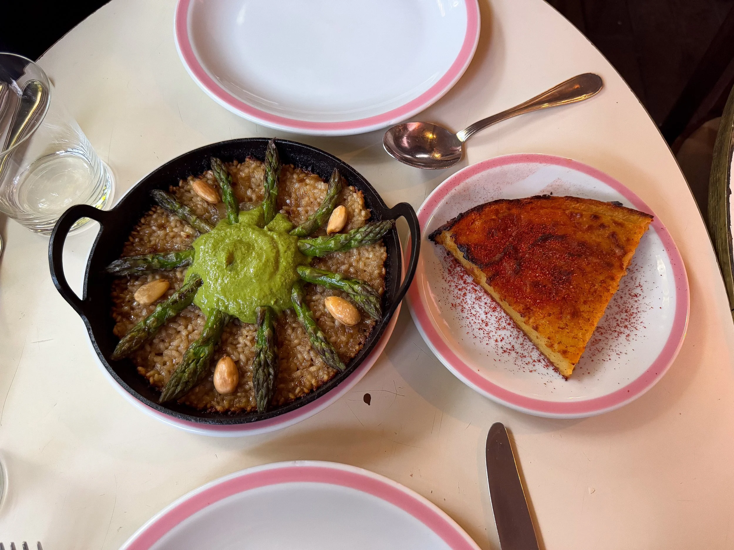 El Preferido de Palermo. A higher end restaurant with a range of homestyle Argentinean and international dishes cooked over coal. We made a reservation ahead of time for dinner, dining in their outdoor patio and sharing a few tapas. First, a smoky spread of baba ganoush with sourdough rolls. Second, faina (chickpea flatbread) with provolone. Third, baked rice topped with asparagus prepared in a cast iron dish. It was similar to a vegetarian paella with a crispy socoratt.