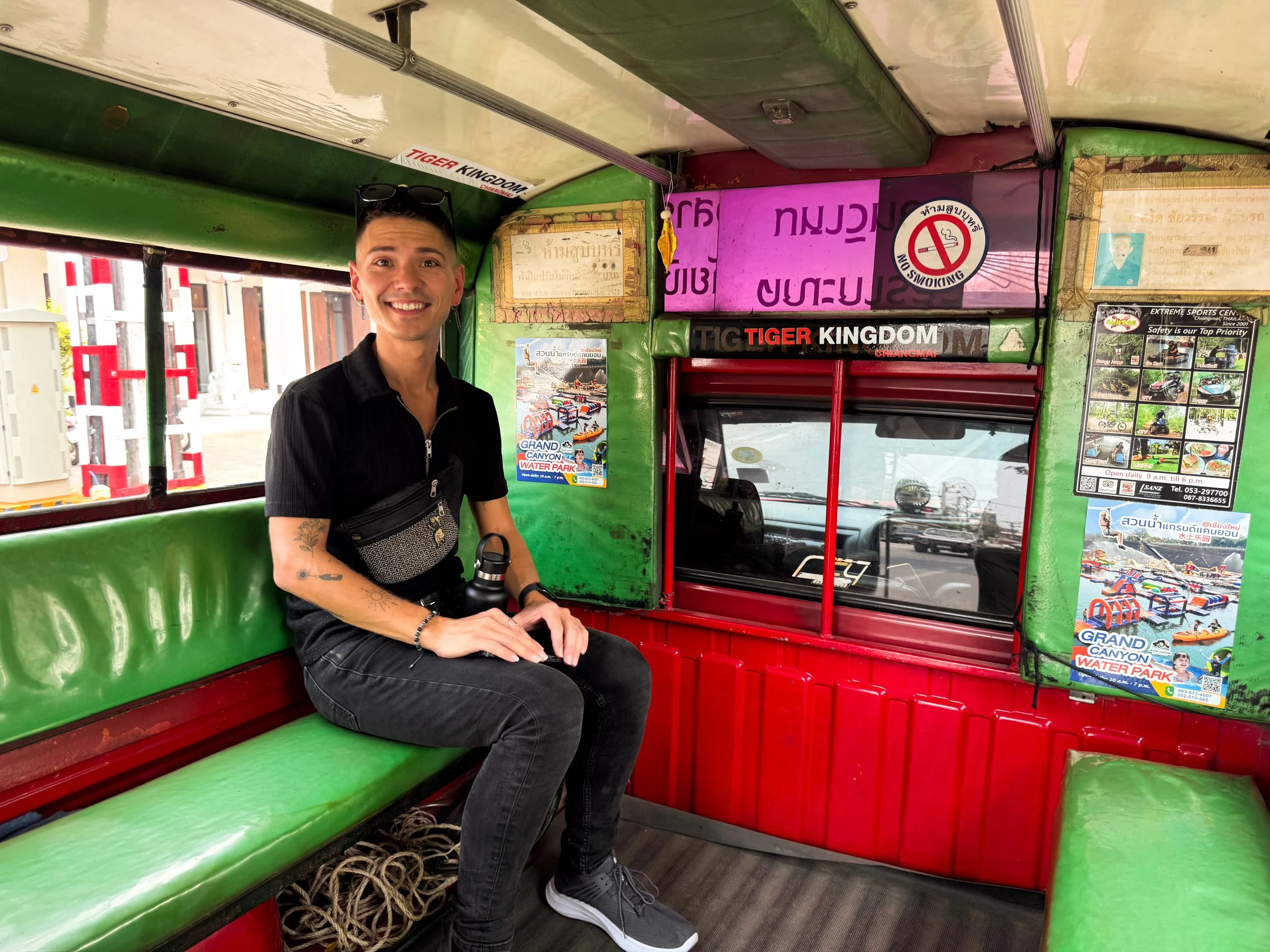 Songthaew. A red pickup truck with a covered back and two benches for passengers. They operate as shared and private taxis, bringing locals and tourists around Chiang Mai and to further away destinations. They’re inexpensive with fares costing 30 - 40 Bhat per person to get around the city. The cost for further away destinations varies however it’s cheaper per person depending on the number passengers. They’re easy to find. typically waiting nearby the Old Town gates but can be flagged down anywhere on the street.
