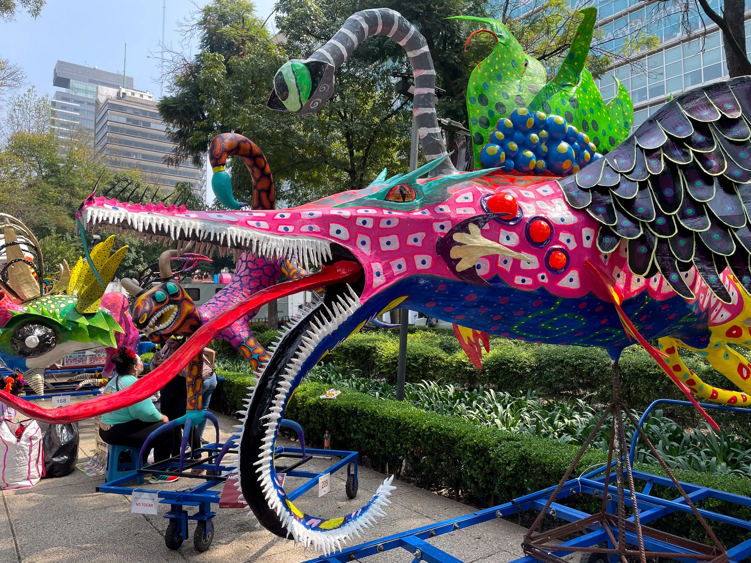 Alebrijes Exhibition. An exhibit with hundreds of large and intricately designed Alebrijes displayed along the Paseo de la Reforma.