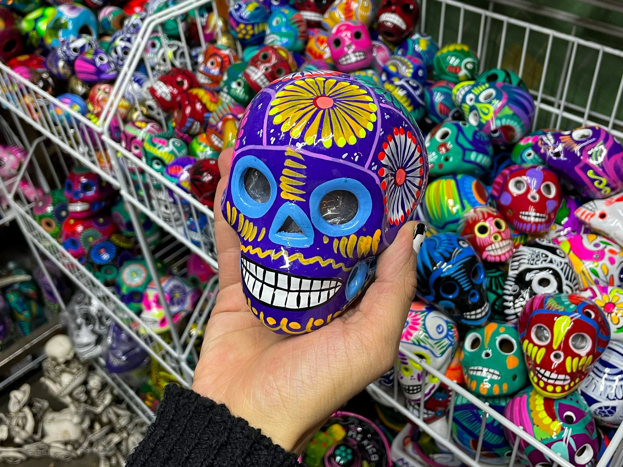 Calaveras. Colorfully painted smiling skulls intended to laugh at death. People’s faces are commonly painted as Calaveras during the Dia de los Muertos festivals and parades.
