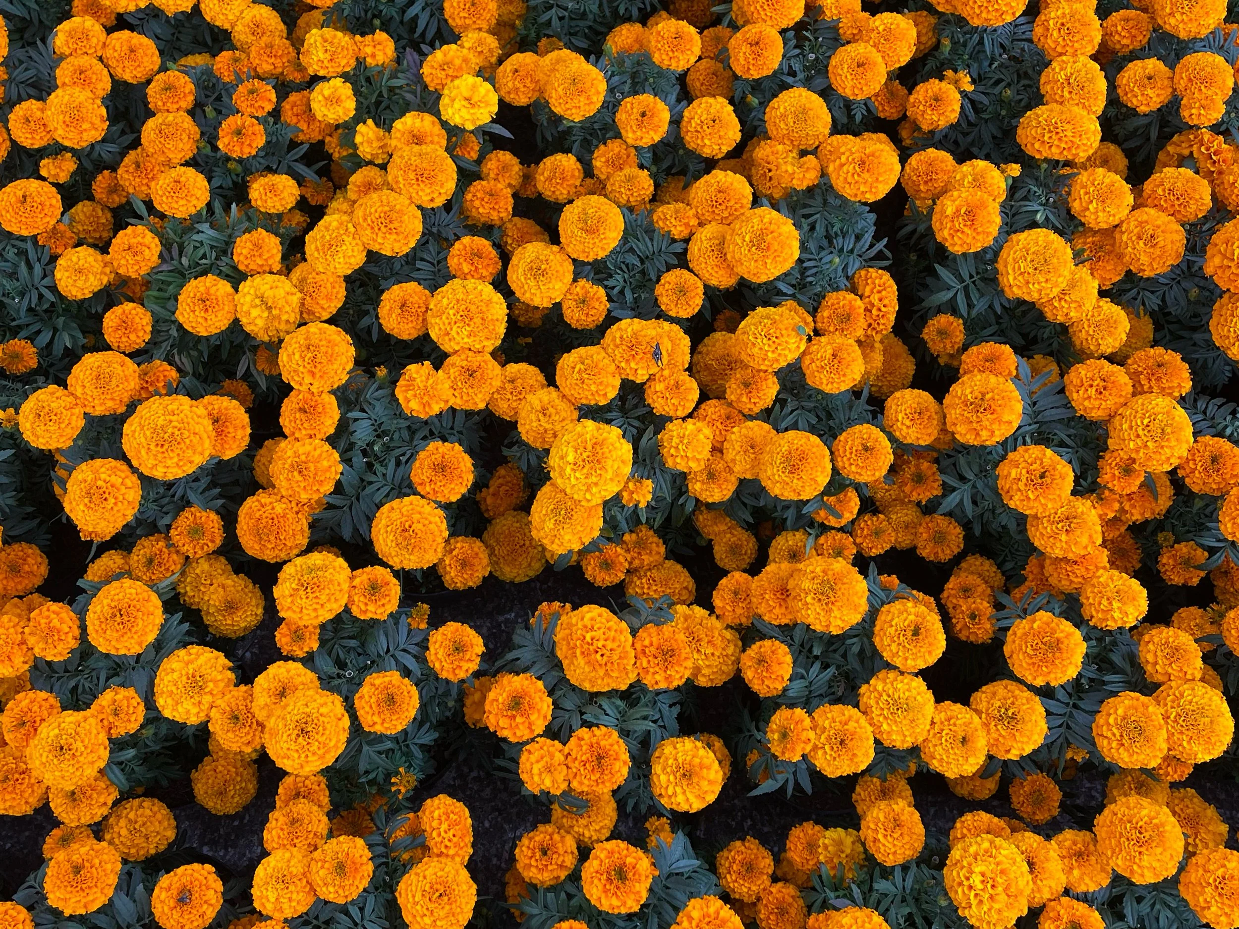 Cempasuchil. The Aztec word for merigold. These orange flowers and their petals decorate ofrendas, homes and public spaces during Day of the Dead.