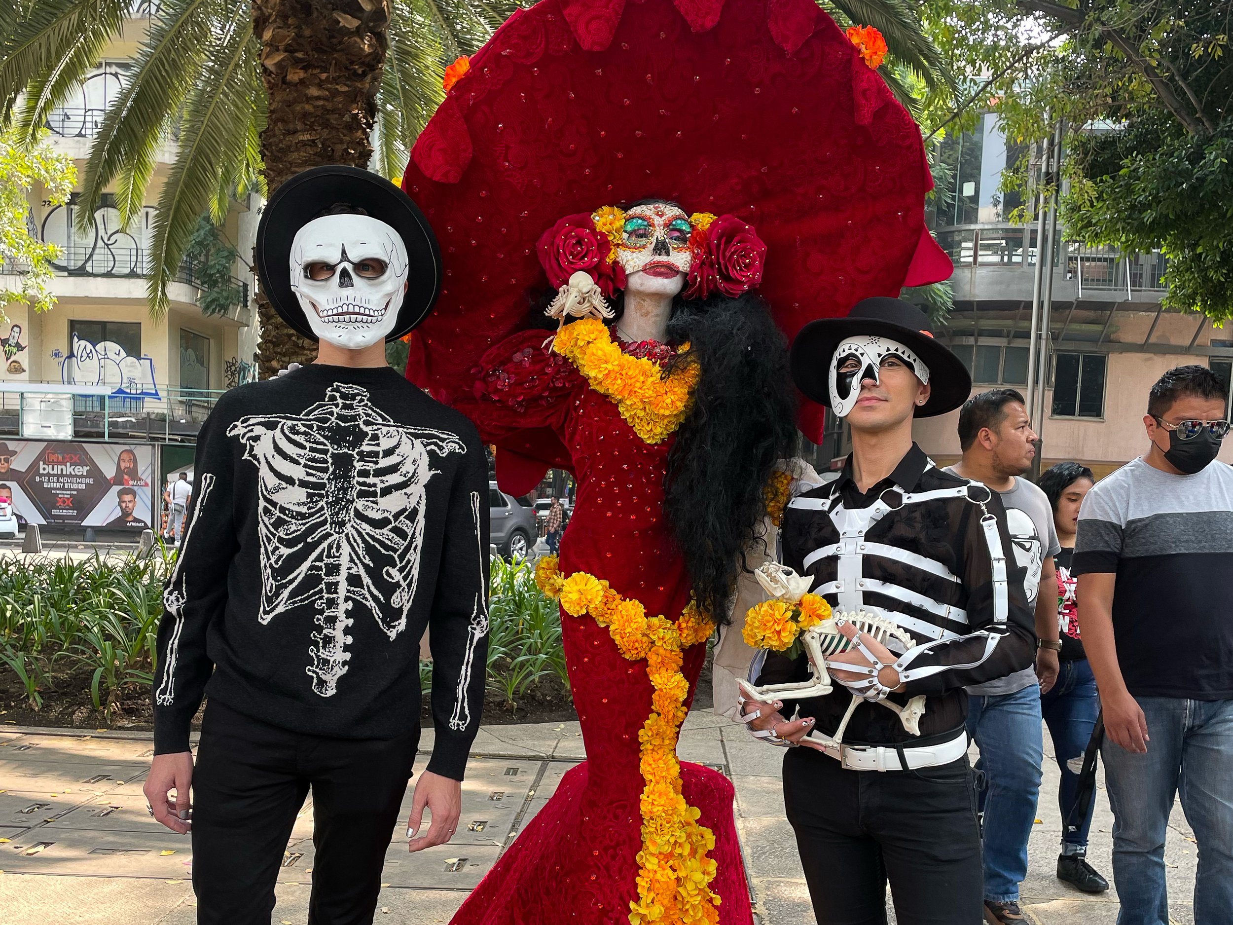 Paseo de la Reforma, a long diagonal avenue that stretches across Mexico City. It is a hub for many of activities during Dia de los Muertos, most notably being the Parade. The median is planted with marigolds while the avenue is lined spectators, makeup artists painting faces, vendors selling street food, decorations, souvenirs, ofrendas and exhibits including:
