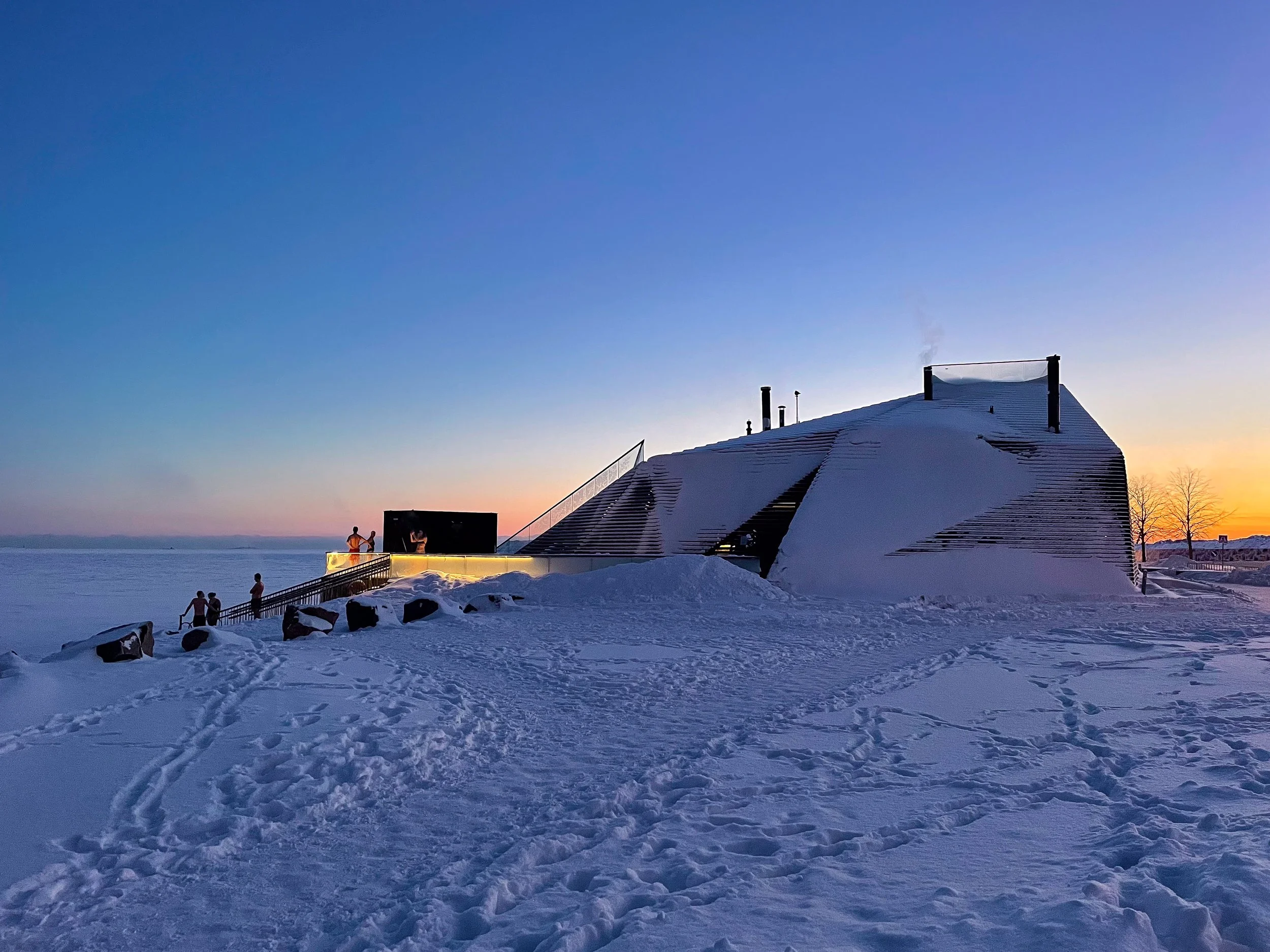 Löyly Sauna. A geometric wooden sauna overlooking the Gulf of Finland with 4 stream rooms including 1 traditional wood burning one and 3 electric ones. Outside is a large deck and cold plunge area in frozen harbor. Inside is a fireplace lounge, restaurant and bar. We tried all 4 saunas, they were hot, steamy and scented of wood. The wood burning one was our favorite with a pleasant smell of smoke. In between steamings, we relaxed by the fireplace with a beer and plunged into the icy harbor during freezing temperatures. Book a reservation in advance and bring flip flops and a swim suit. Lockers and towels are included.
