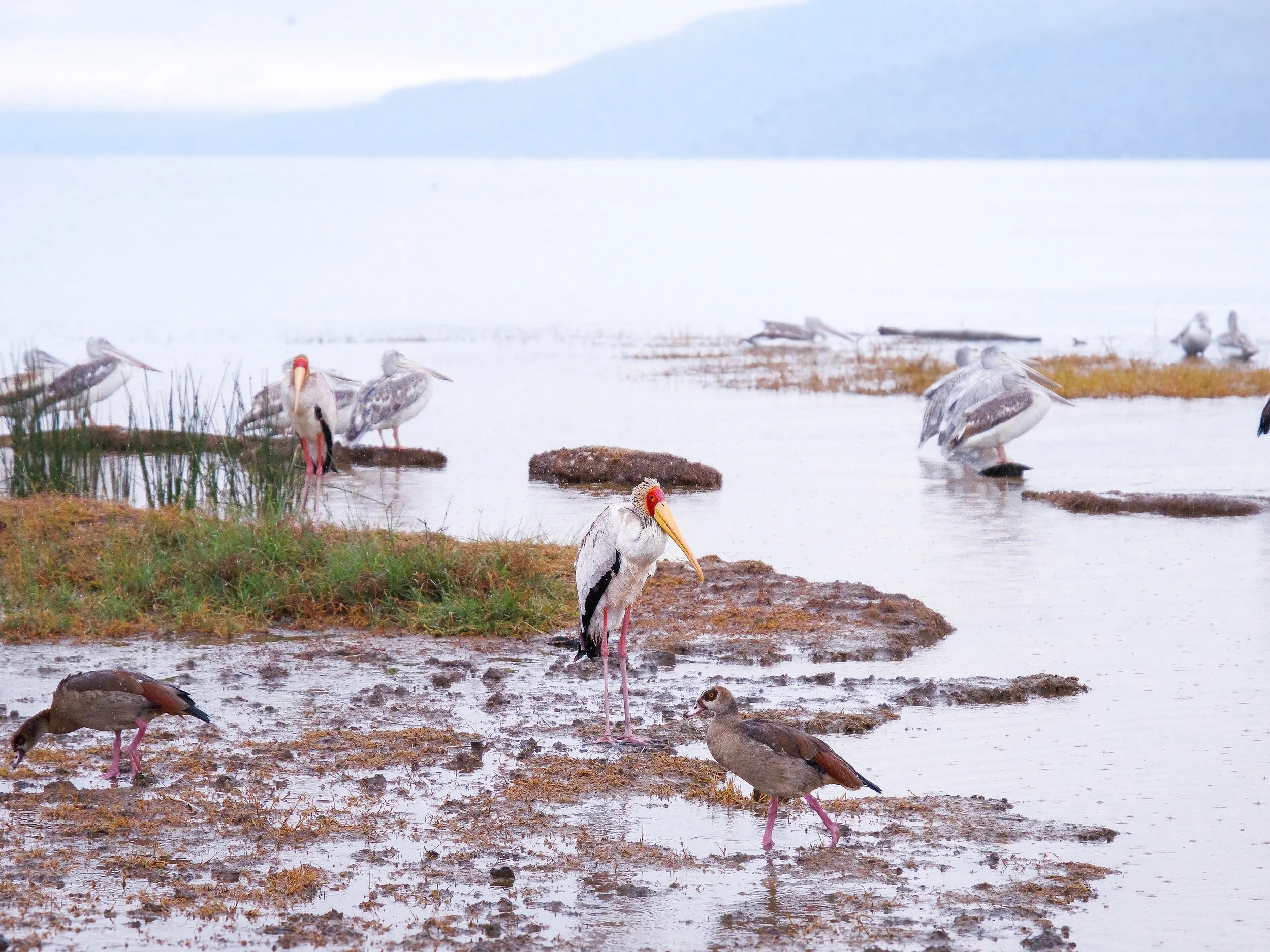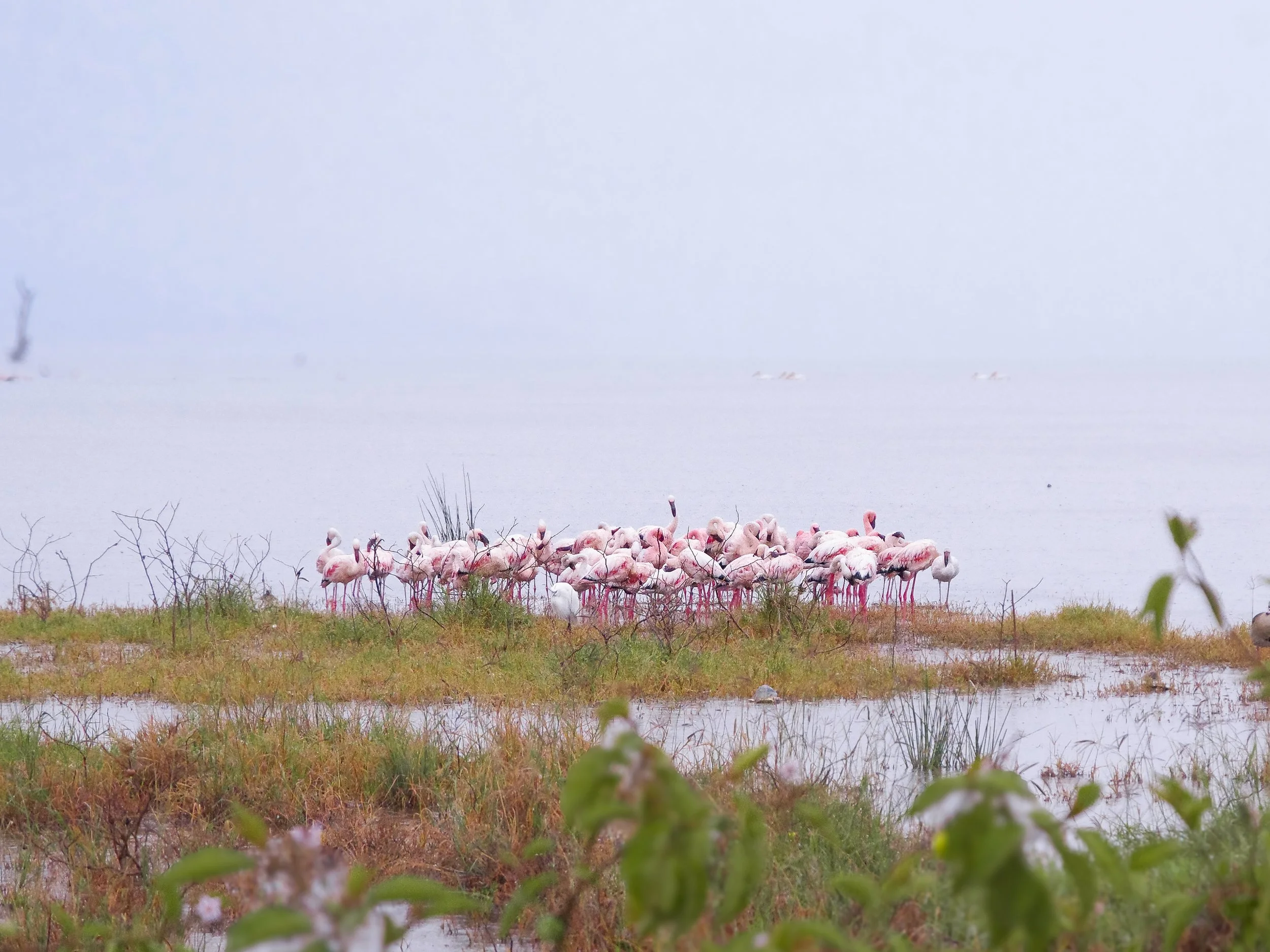 Wetlands. The wetlands of the Amboseli are a gathering place and a habitat for birdlife. At their center is a mirror-like lake surrounded by lush grasses where flocks of pink and white flamingos gather. Storks, herons, cranes and hamerkops hunt for fish in narrow streams. Hippos bathe in watering holes and lounge along the muddy shores.