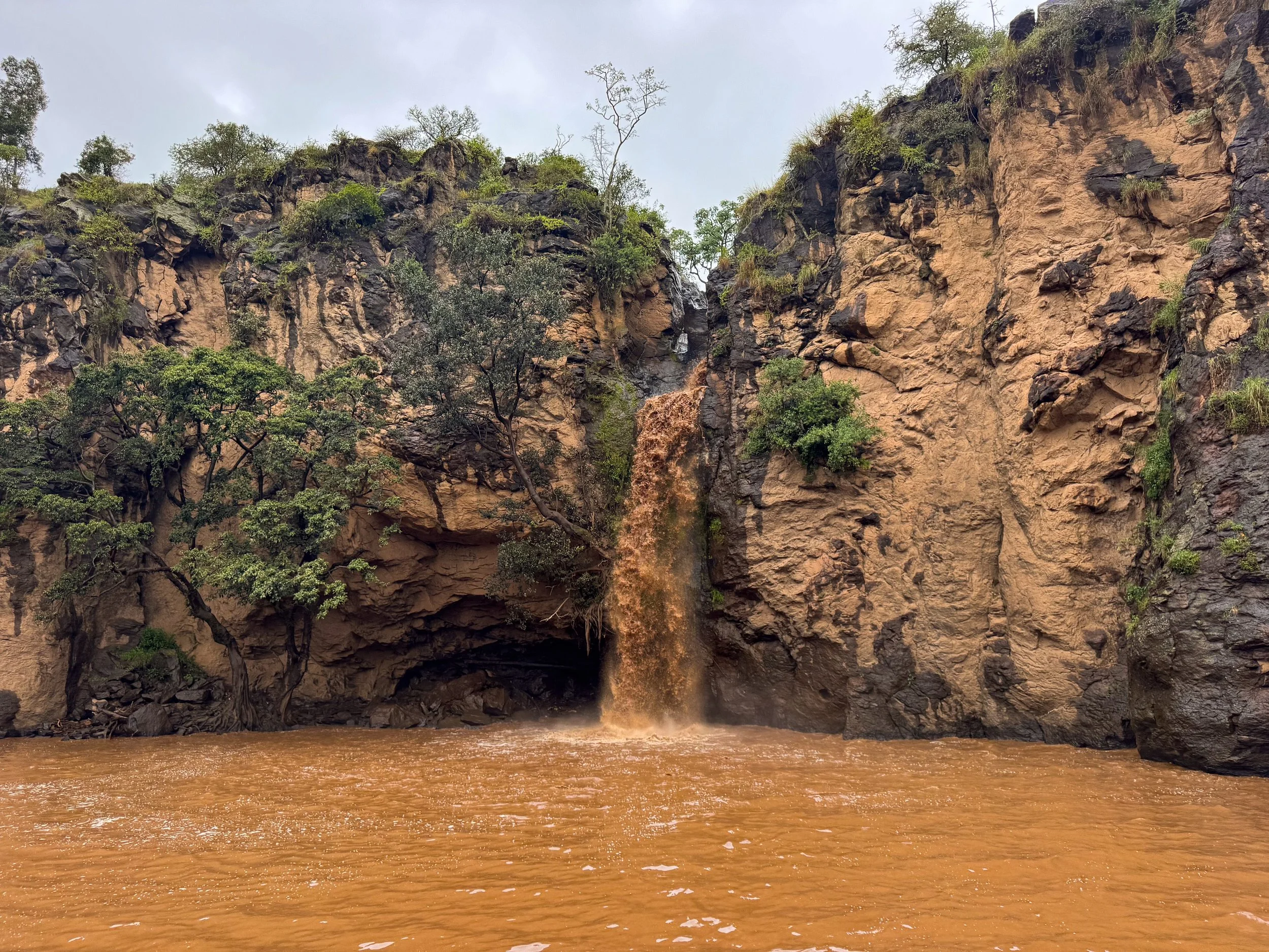 Makalia Falls. A 10 meter tall waterfall spilling over a rocky cliff into a river pool. The water was a rich chocolaty brown color due to recent strong rains.