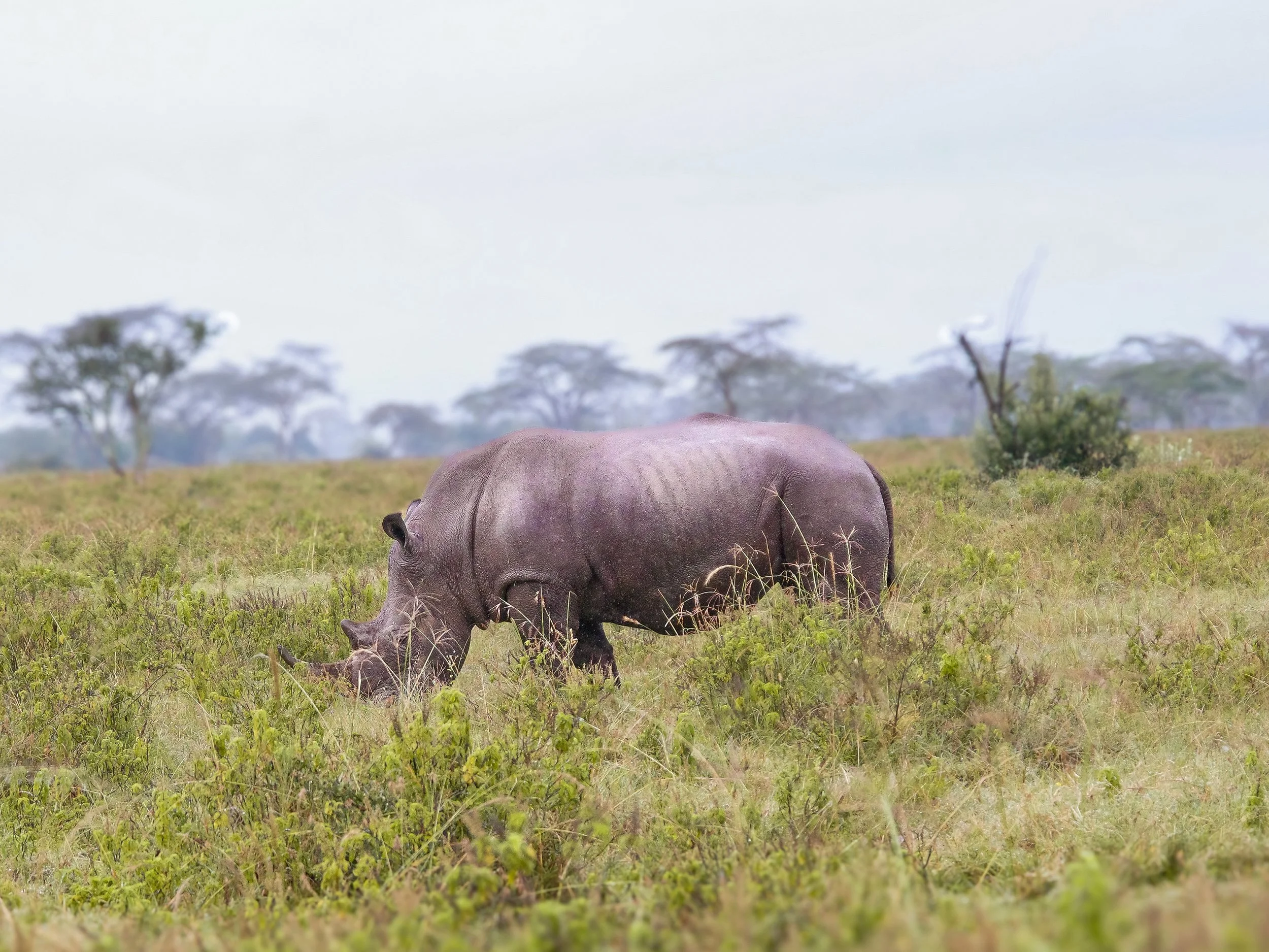 Southern White Rhino. The reserve surrounding Lake Nakuru is home to a growing population of Southern White Rhinos. We spotted several on our safari around the lake. A mother and calf stood together in the bushes, a group of three grazed in the a field and a full crush of six rested in the distance grasses.
