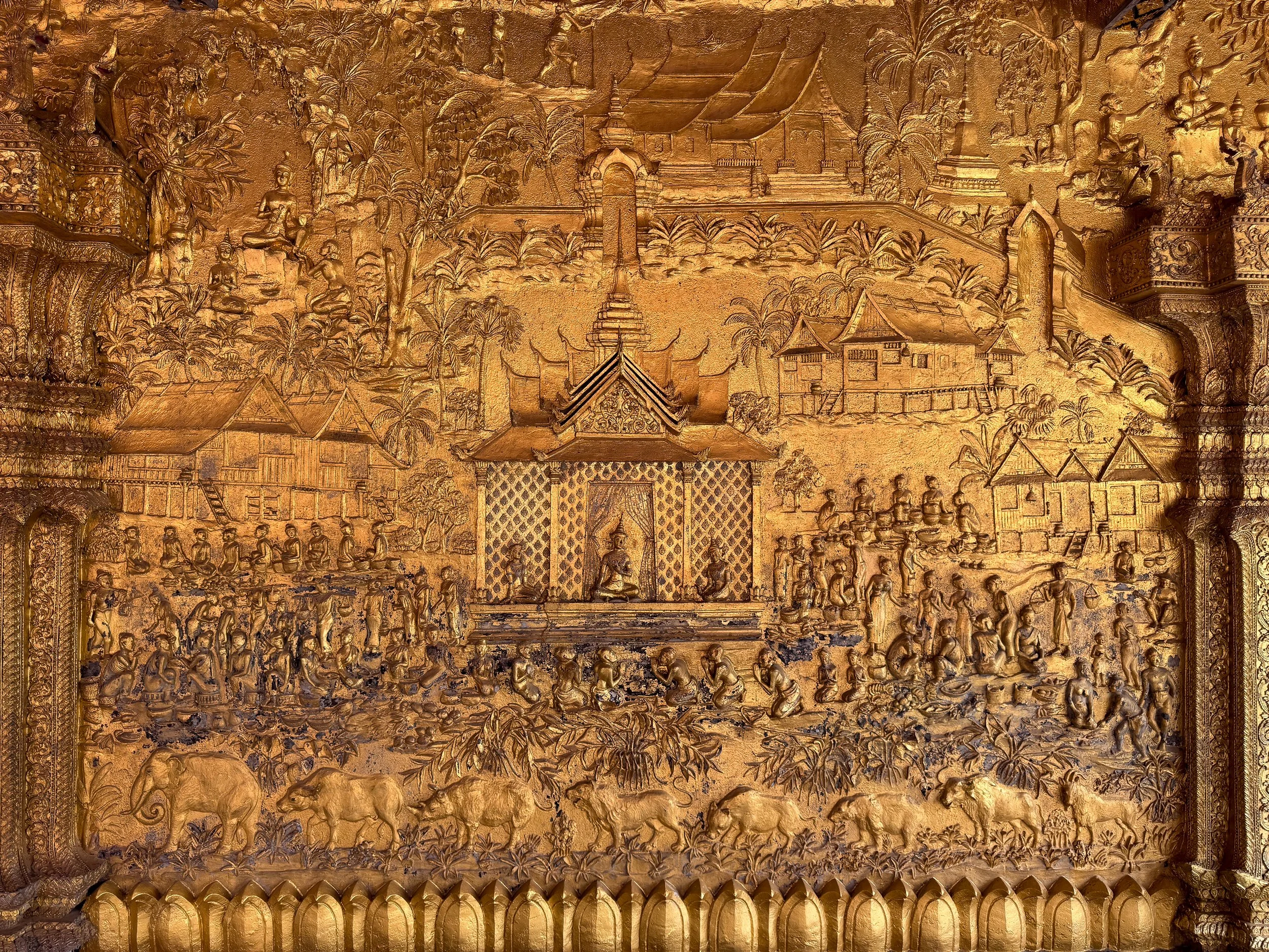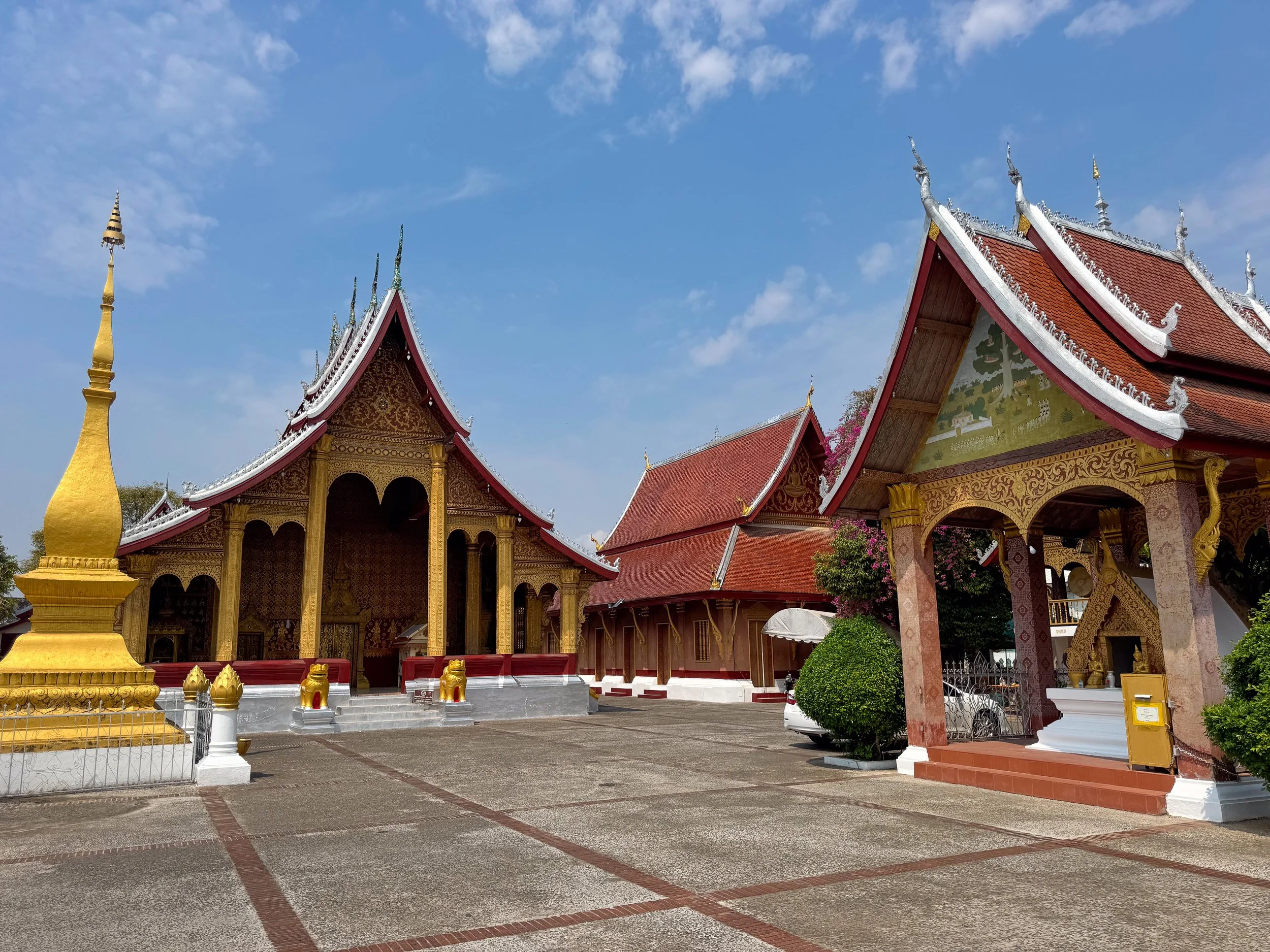 Wat Pa Hauk. A small temple at the base of Phousi Hill across from the National Museum. It features a mix of architectural elements including wooden columns, ornately carved moldings, a detailed facade and roof inlaid with gold, silver, blue and green glass mosaic tiles.