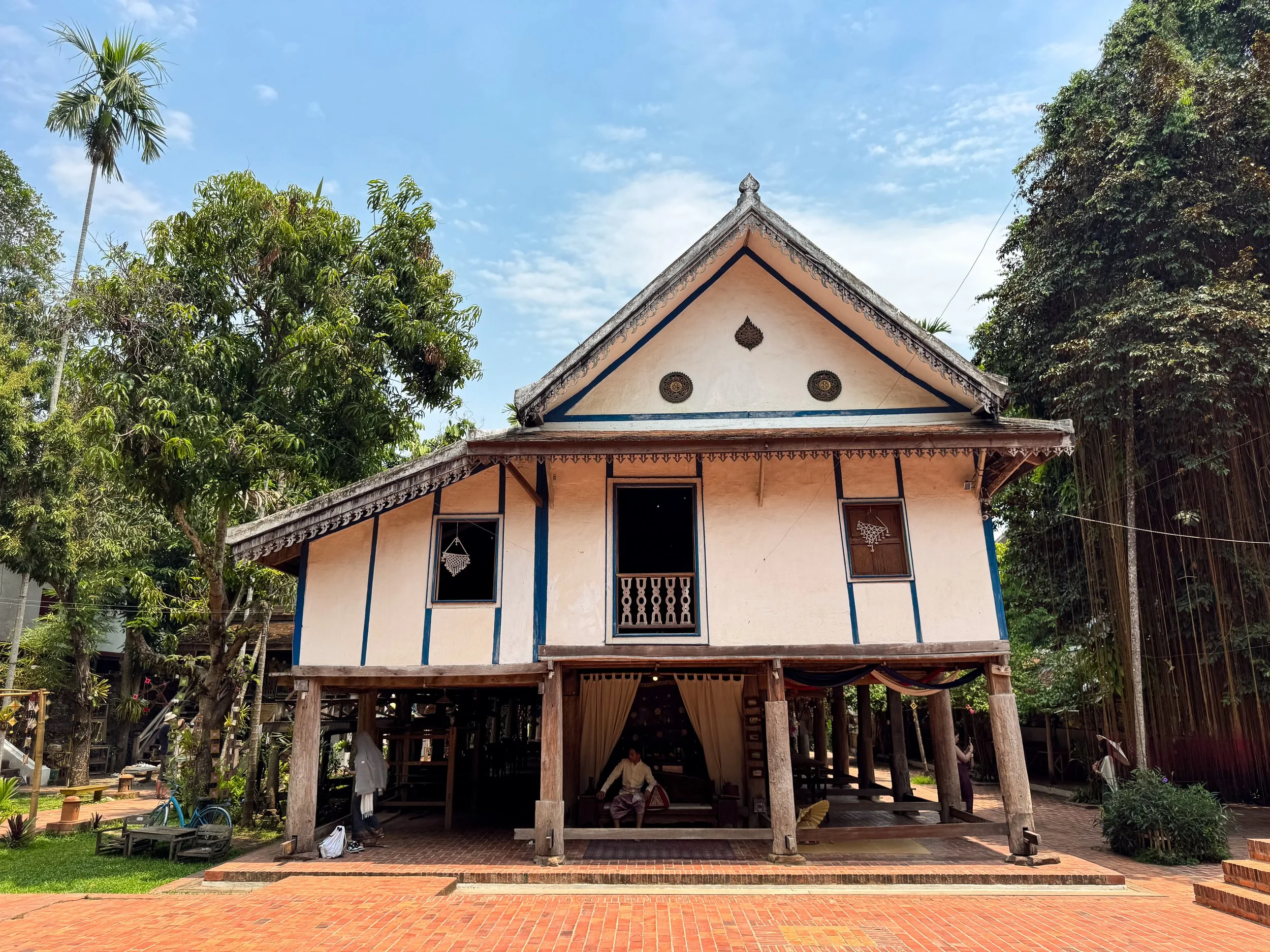 Luang Prabang Heritage House. A cultural center and museum dedicated to preserving the history, traditions and customs of Luang Prabang. Inside the rooms of a historic wooden stilt house are displays with classical musical instruments, cooking equipment, textiles, clothing and ceremonial home goods. Cooking and craft classes like bamboo weaving and mulberry paper making are regularly offered. Locals come here to rent traditional clothes for photoshoots around the property. An adjoined cafe offers local dishes and herbal teas. We drank iced beal fruit and pandan leaf teas on cushions under the stilt house. The museum is located on a brick alleyway surrounded by Buddhist wats and other historic homes.