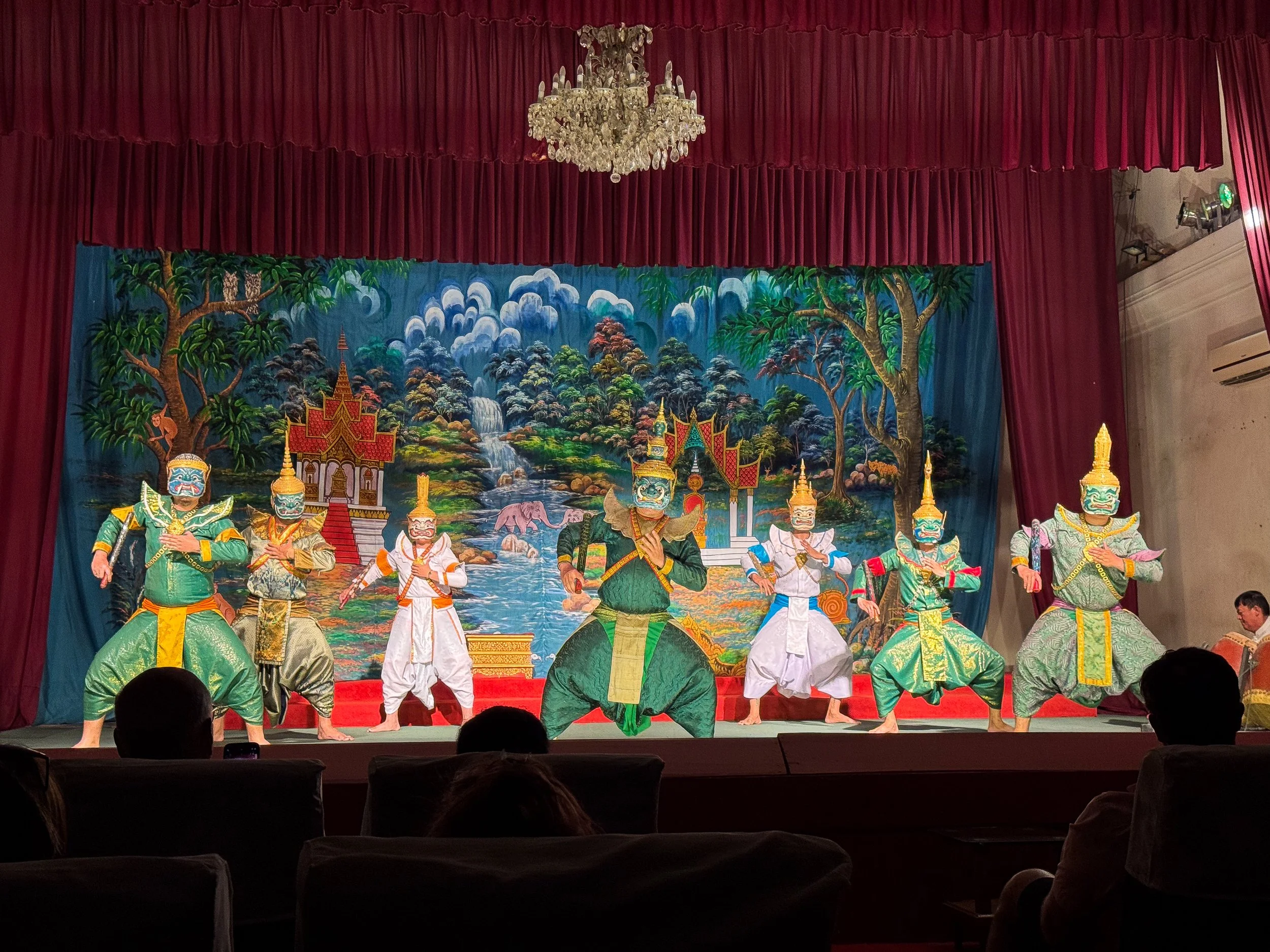 The Royal Ballet. A traditional ballet performance with over two dozen dancers dressed in elaborate silk costumes, painted face masks and golden pointed crowns. Musicians play classical Lao instruments including wooden xylophones, brass gongs and drums. We saw the final chapter the Thotsakan, a Hindu and Buddhist legend, telling the story of how the king of demons is defeated in battle. The dancers moved gracefully, in rhythmic motions and moved suddenly for dramatic effect. The performance lasted an hour and was truly a cultural and visual treat. The theater offer one show per night multiple times per week in the Ramayana Hall at the National Museum.
