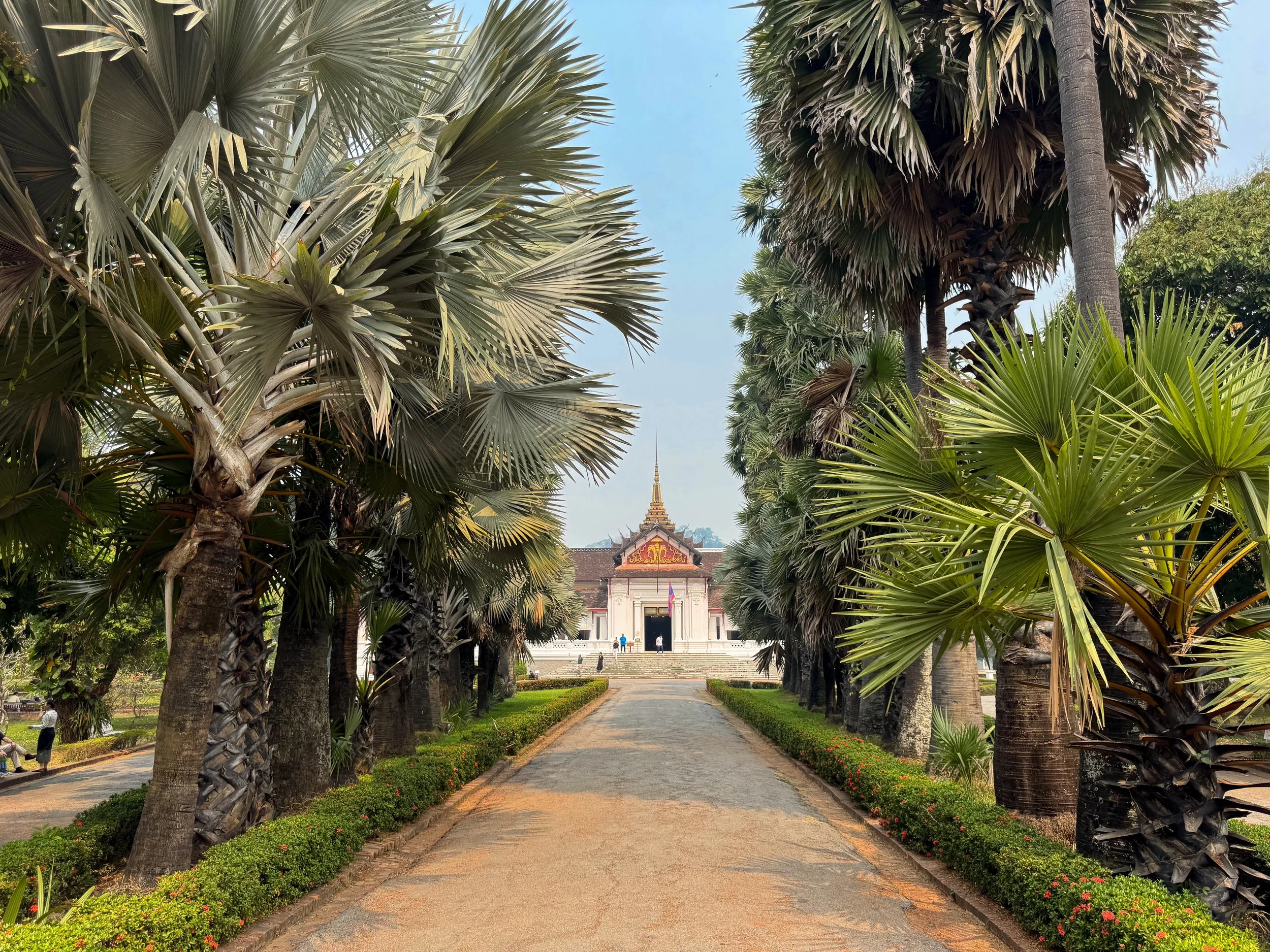 Luang Prabang National Museum. The museum and grounds feature the royal residence of Laos’ former monarchy. A palm lined driveway leads to its entrance and reception decorated with colorful paintings of the countryside. The elaborate throne room is decorated in colorful glass mosaics depicting stories of Lao history and the Prabang Buddha. On display are Buddhist and royal relics including thrones, crowns, swords, houdahs, amulets, clothing and statuettes. The remainder of the home is more simplistic with tall ceilings, wide corridors along the perimeter and spacious bedrooms.