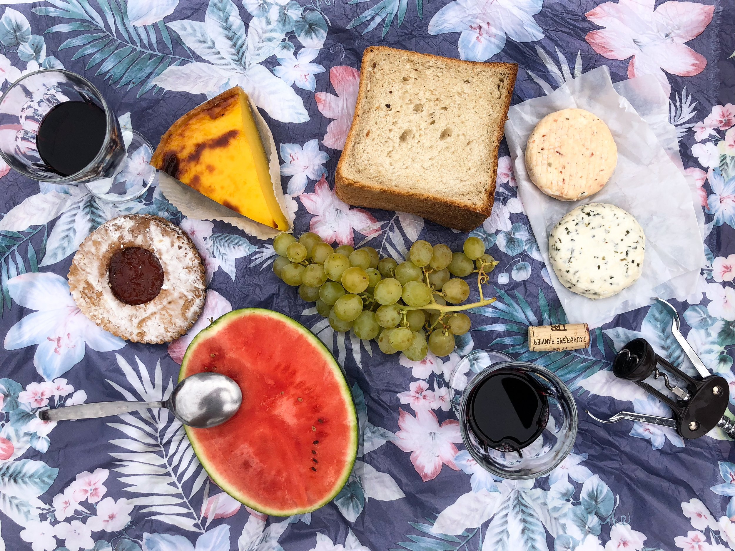 Fresh from the Cours Julien Farmer’s Market, we sat down on the lawn of the Jardins du Pharo for an afternoon picnic. We shared a half watermelon, bunch of grapes, custard tart, jammed cookie, stinky and herbal cheeses, bread and French wine.