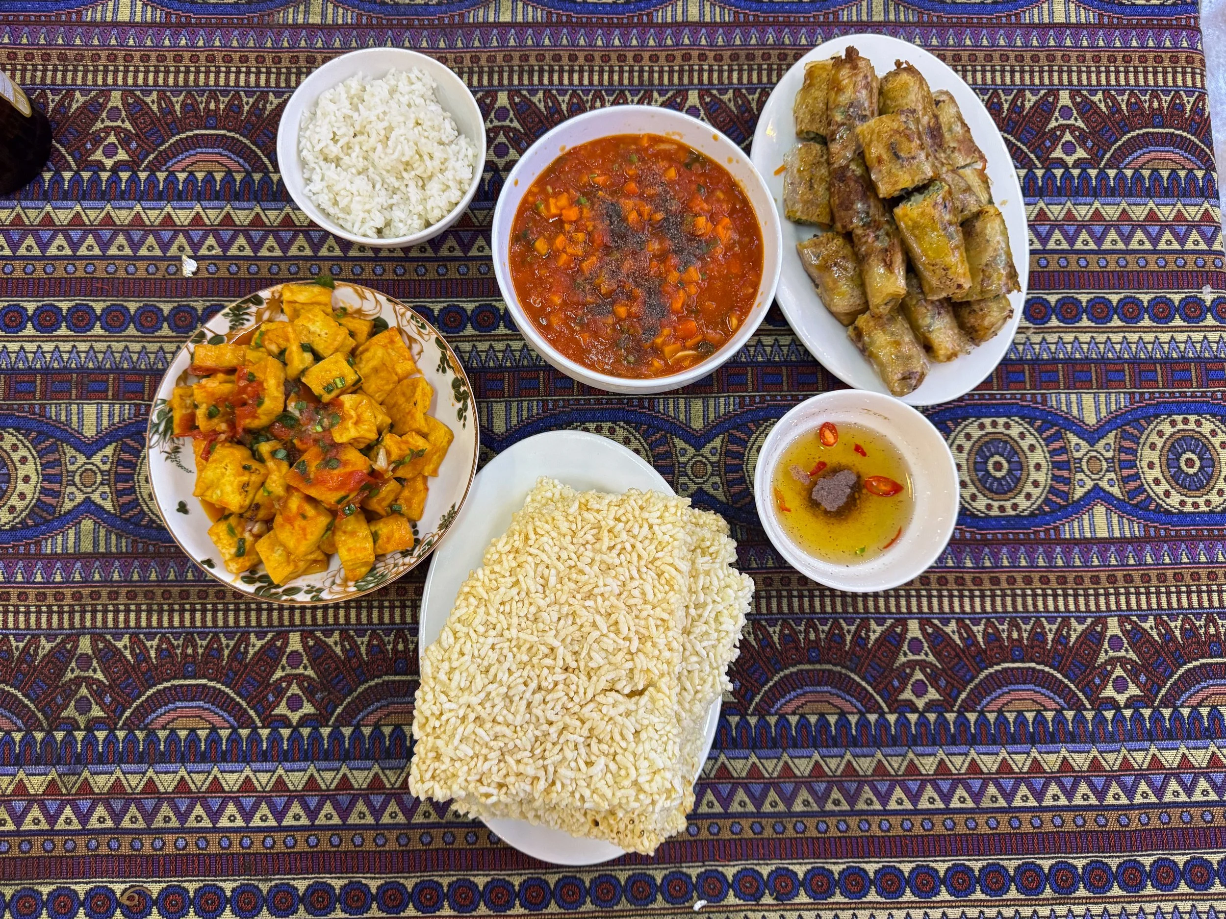 Trang An NP. A roadside restaurant in the village with generous portions of local dishes. We tried the burnt rice with vegetable stew, the crispy spring rolls and tomato tofu.