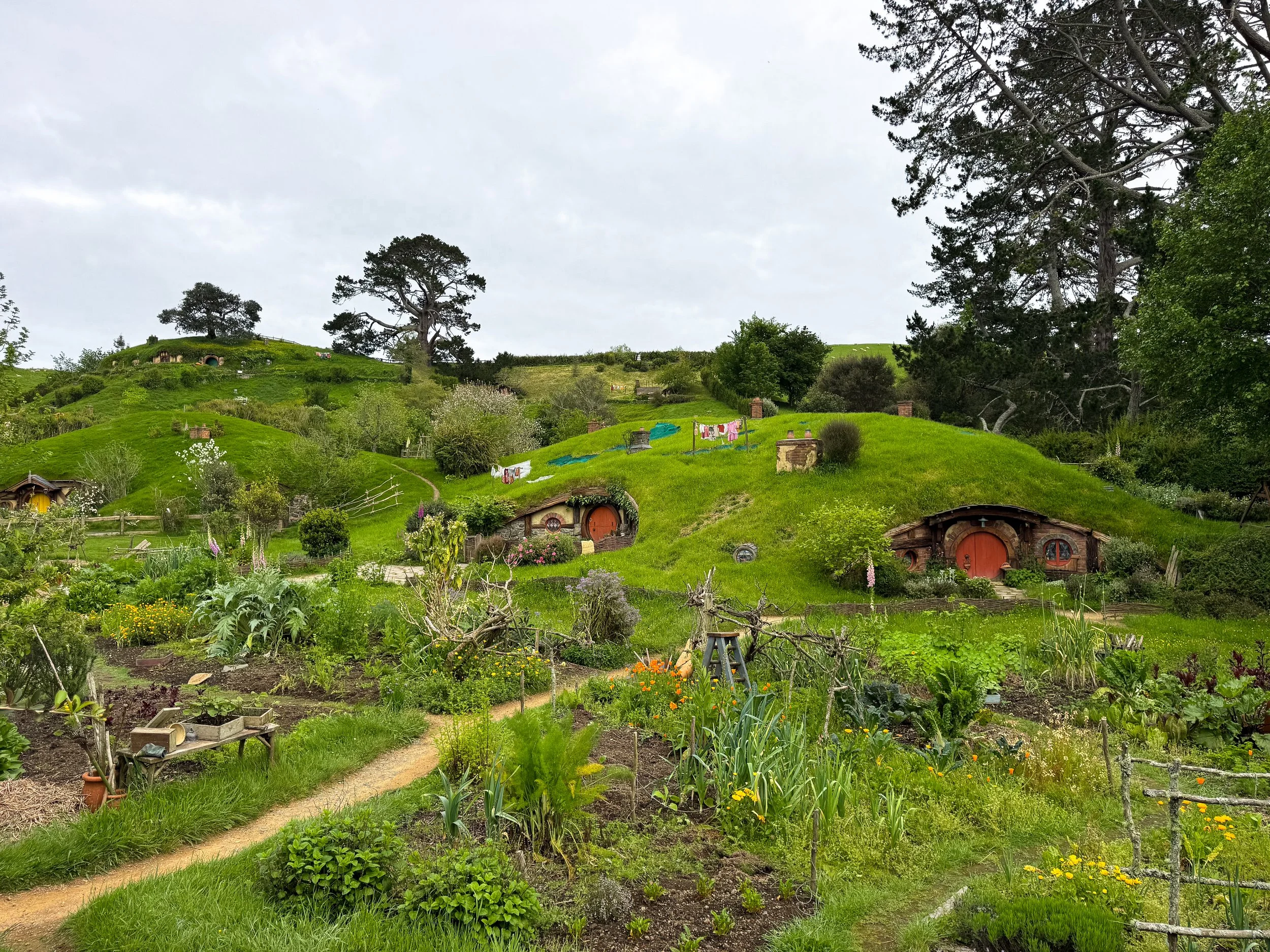 Hobbiton is the fictional movie set built for the Lord of the Rings and Hobbit Trilogies. The whimsical village spans a verdant hillside of a functioning sheep farm. Dirt walkways meander past “hobbit holes” built into the faces of grassy mounds. Round doorways and tiny windows peer inside. Flower and veggie gardens sprout beyond wooden picket fences. Smoke rises from brick chimneys poking out of the hilltops. Guided tours include stops at iconic film sights like Bag End, The Party Field, Bagshot Row and The Green Dragon Inn.