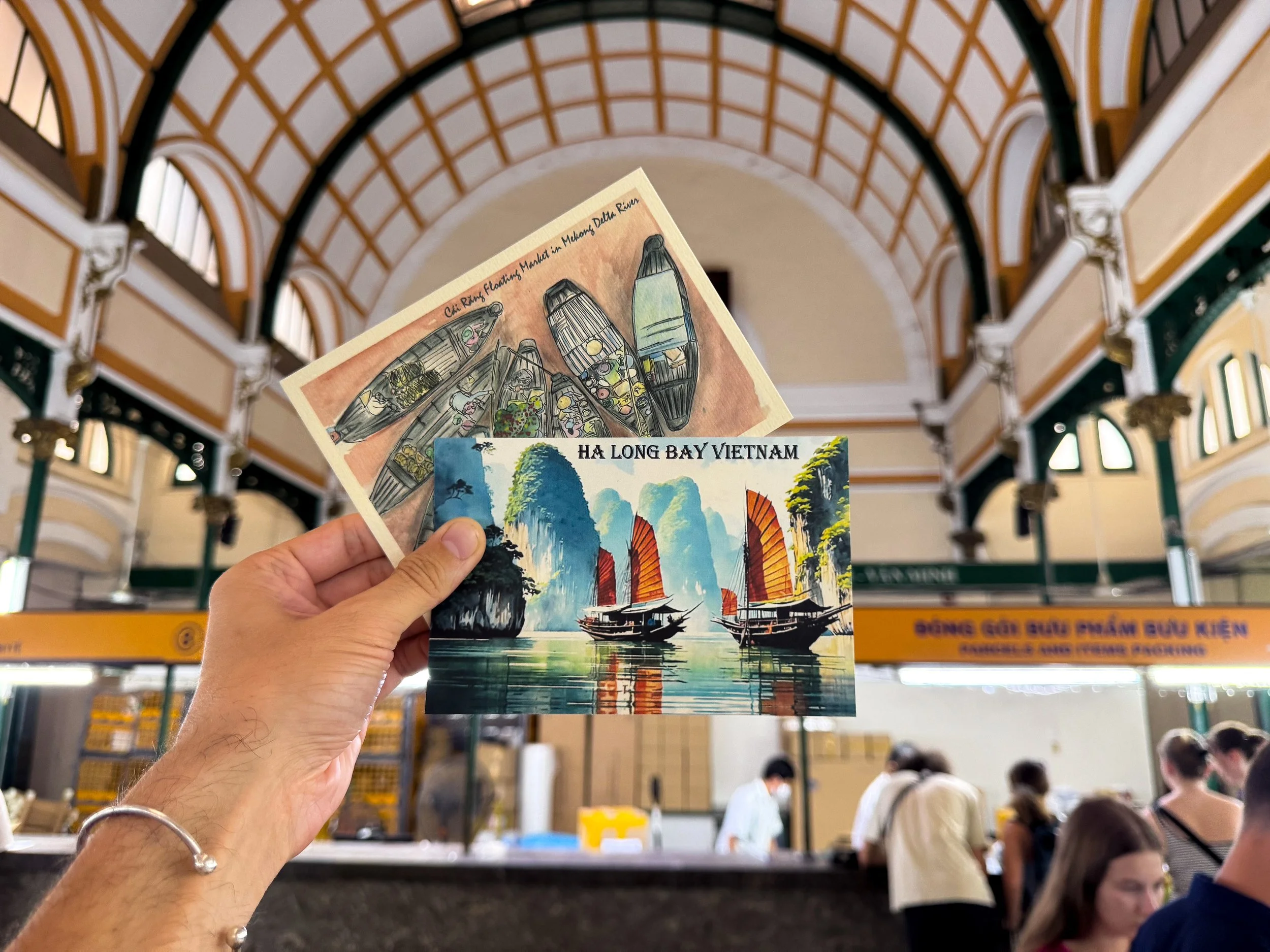 Mail a Post Card. Visit the French Colonial style Ho Chi Minh Post Office to buy a post card and mail it back home. Baskets of post cards feature Vietnamese artwork, historic sights and cultural symbols. We bought a couple, stamped them with local postage and sent them on their way around the world. It’s very touristy and fun experience that brings back the nostalgia of traveling in a time before smart phones and social media.