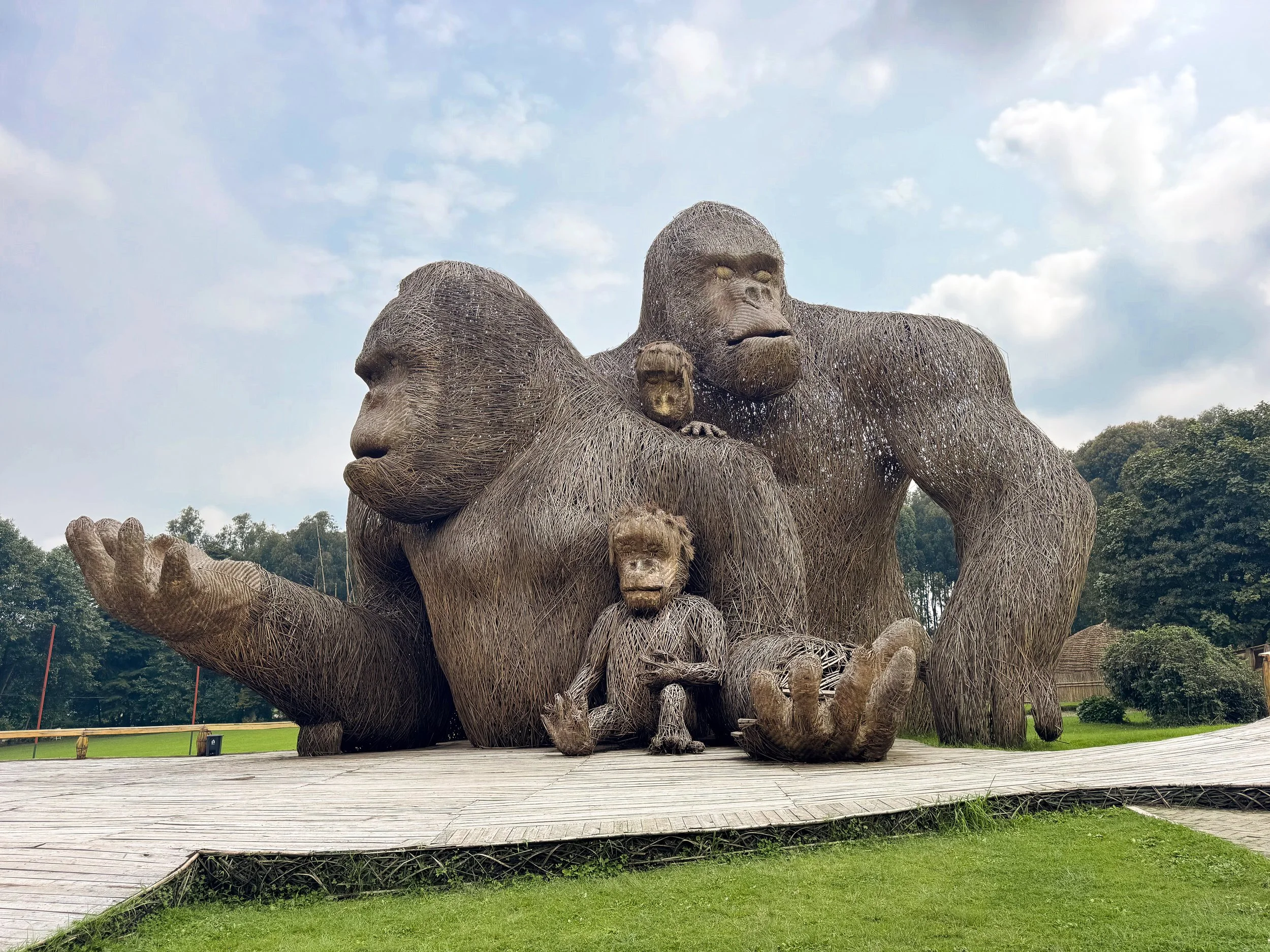 Gorilla Naming Place.  A large thatched monument of a family of Gorillas. The largest gorilla’s hands are outstretched, creating a platform for photos. Behind is a replica village with three thatched huts.