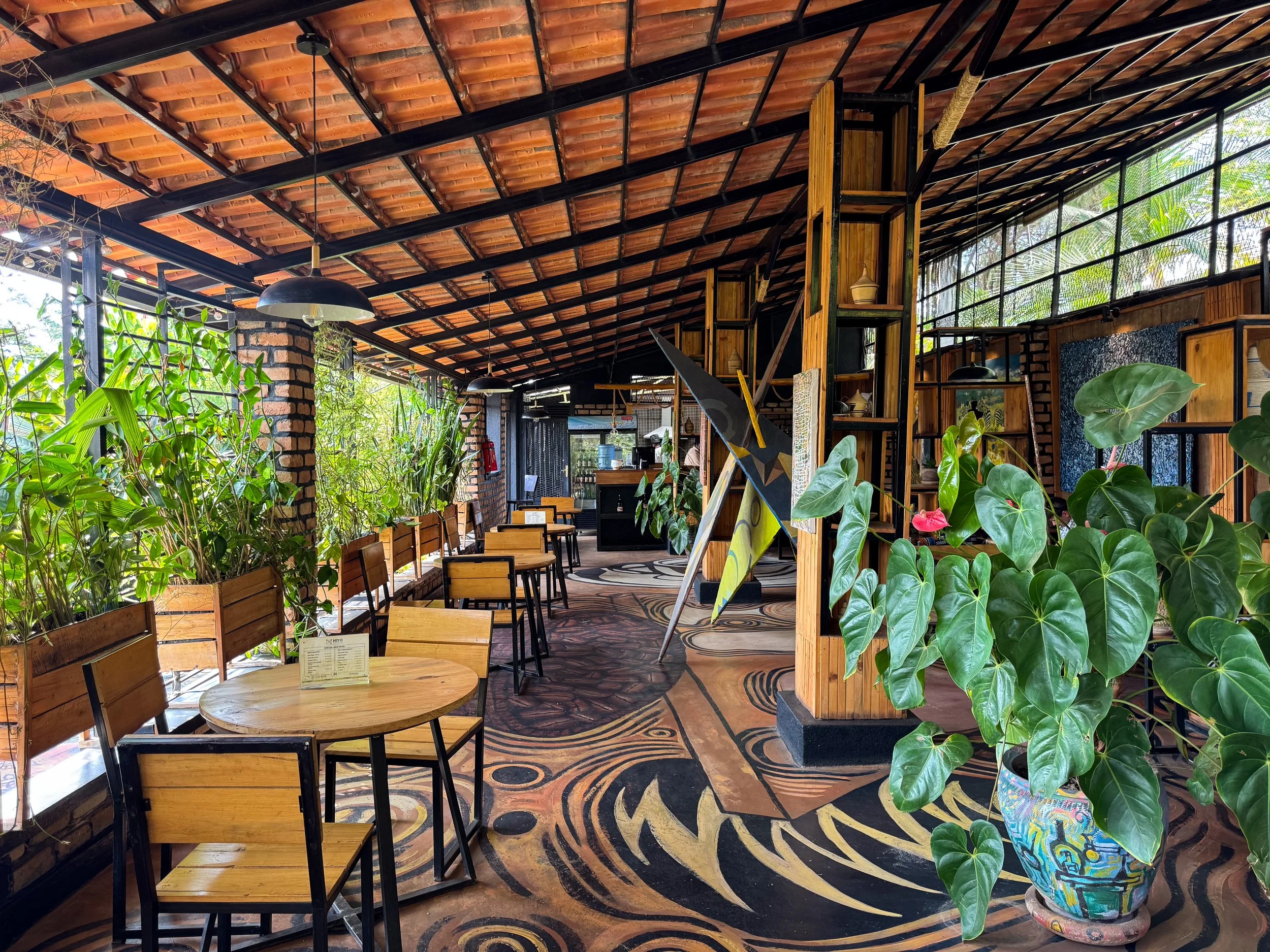 Niyo Art Cafe.  An open air cafe with vibrant murals spanning the floor from the street to the interior. The dining area is decorated with patterned Rwandan textiles, sculptures, paintings and plants. Come here for coffee!