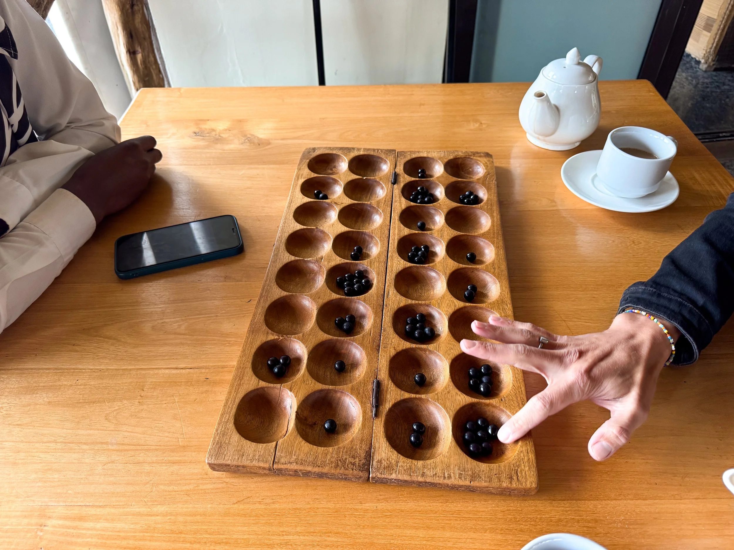 Igisoro.  A traditional two player strategy game where opponents “eat” or compete for each other’s pieces along a pitted board. We learned to play while sipping on African Coffee.