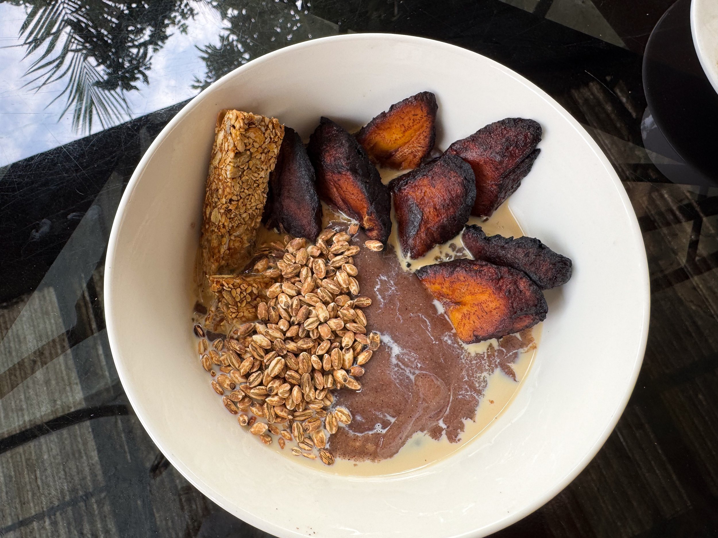 • Agatogo.  A savory one pot stew made with green bananas, collared greens, spinach, tomato, bell peppers, onions and spices. It’s garnished with avocado and peanut crumble.