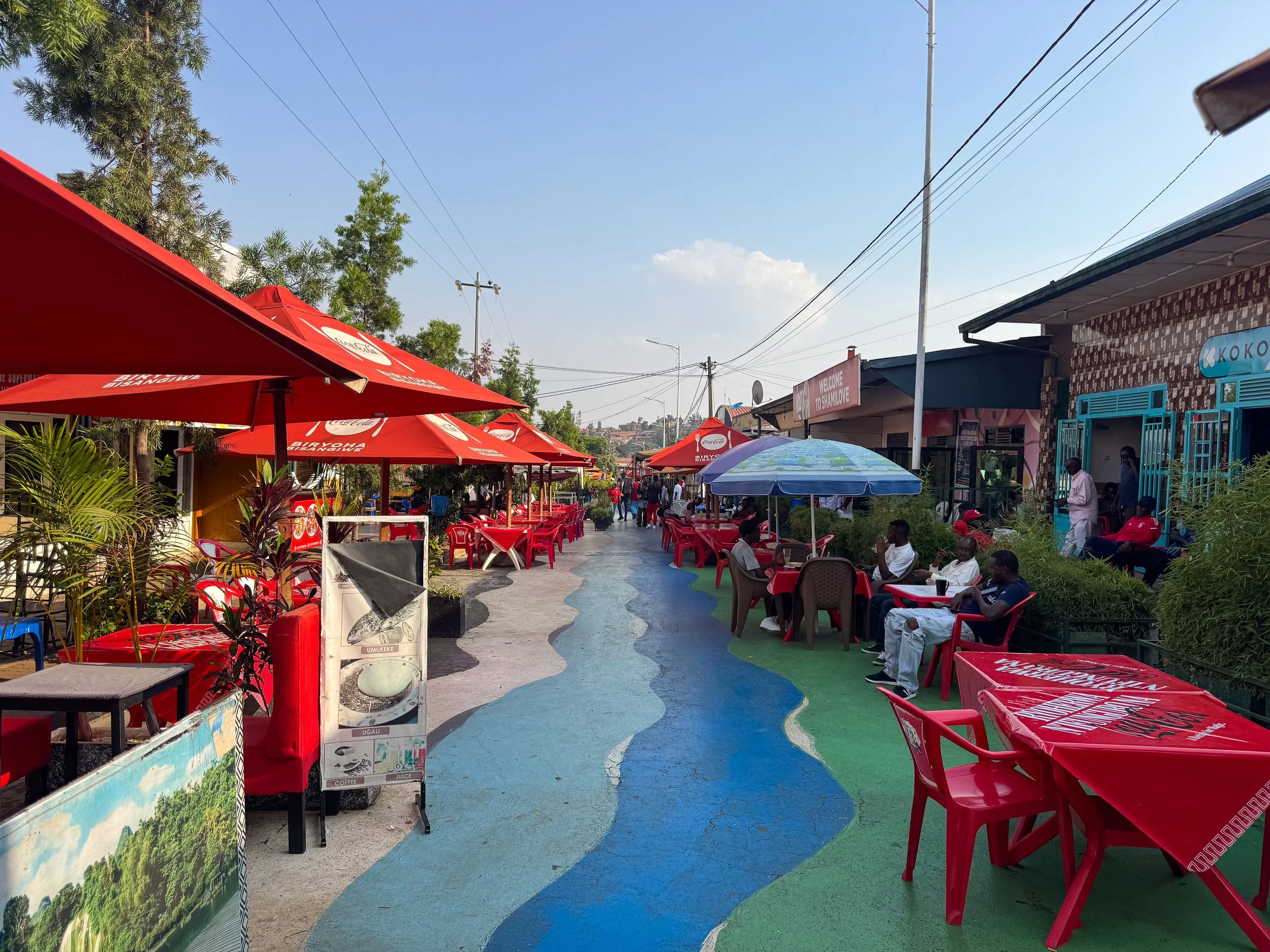 Biryogo Car Free Food Street.  A painted walking street lined with dozens of Rwandan, Arabian and South Asian restaurants. Tables, chairs and umbrellas flood the street as hosts advertise and compete for business. It’s a hyper local spot to taste Rwandan cuisine and regional flavors. We ate at Visit Rwanda, a restaurant serving a range of local dishes and fresh fruit juices. We ordered the Nile perch fish brochettes, vegetarian imvange amashaza, spiced rice pilau, tree tomato and passion fruit juices. Visit on Saturday night for the liveliest experience.