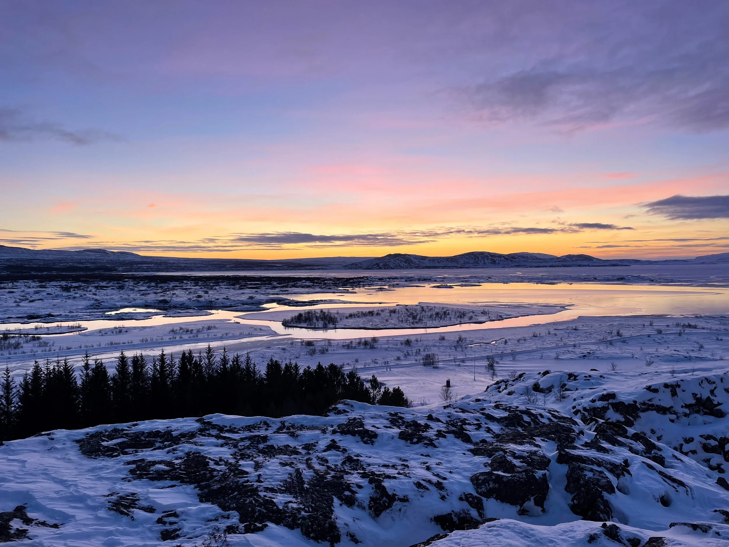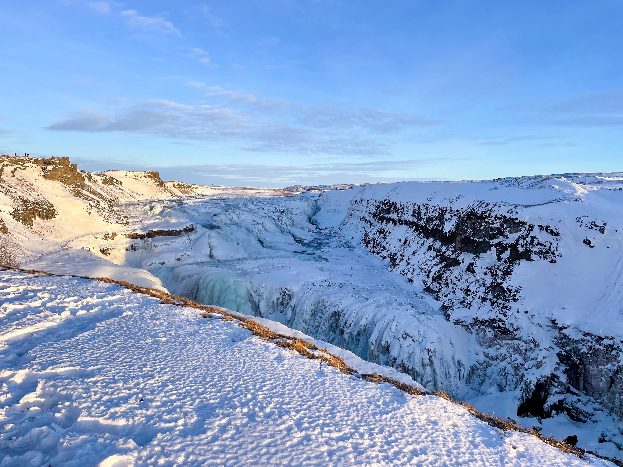The Almannagjá Fault Line is the location is where the North American and Eurasian plates are visibly pulling apart. We arrived just before sunrise. The sky was light pink and yellow in the early morning light, tones that were reflected by the white snow covered landscape. From a lookout, we admired the vast fissure that split the landscape in half, spanning for miles in both directions. After watching the sun rise, we followed a trail that descended into the fissure. On both sides of us were walls of jagged rocks dusted in fresh snow. The trail continued a few kilometers further.