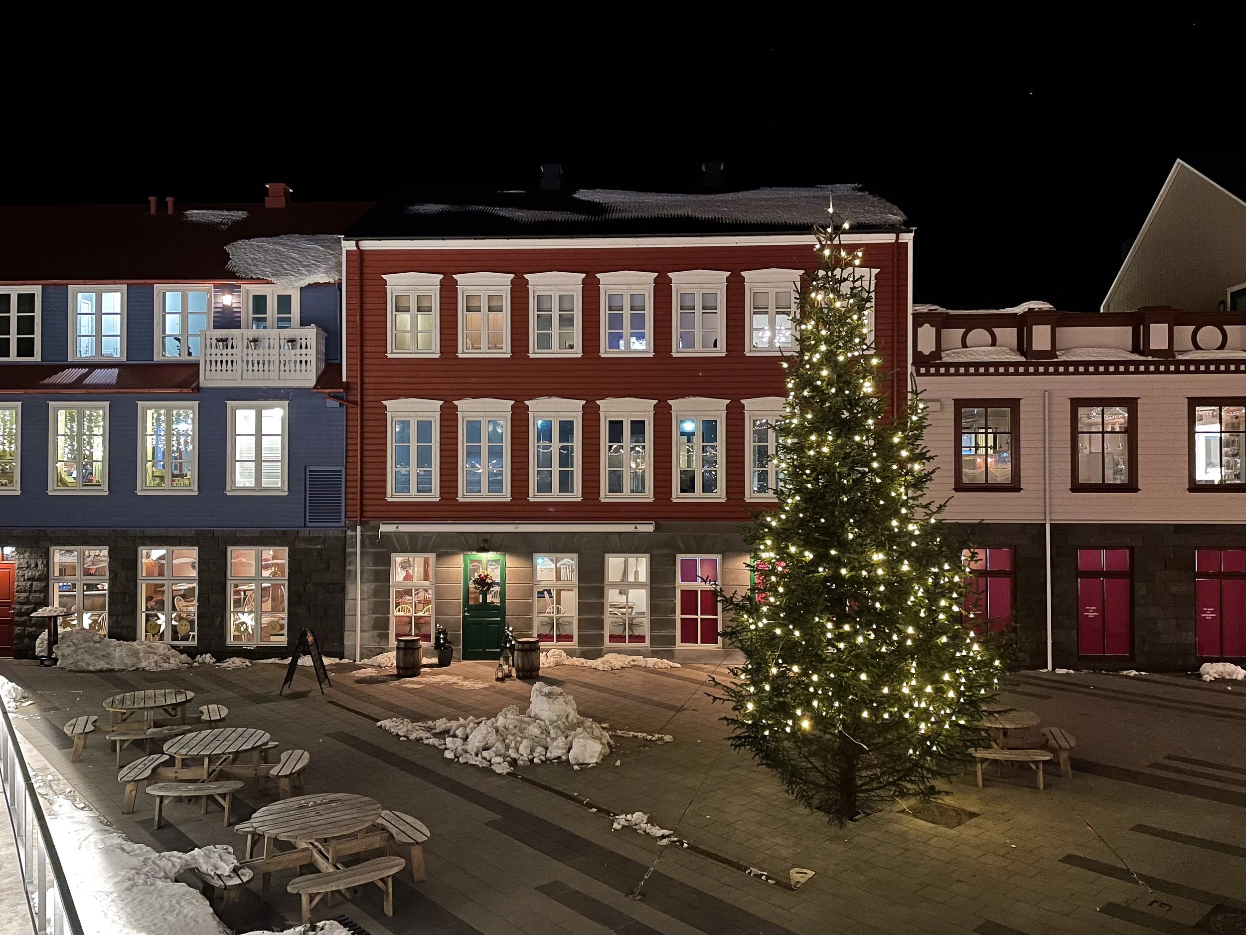 After exploring glaciers, black sand beaches and waterfalls, we drove to the town of Selfoss for dinner in the town square. A renovated but historic site with traditional Icelandic architecture with colorful buildings, ornate moldings and gridded windows. The square had a holiday feel with piles of snow, string lights and a glittering Christmas tree still on display.