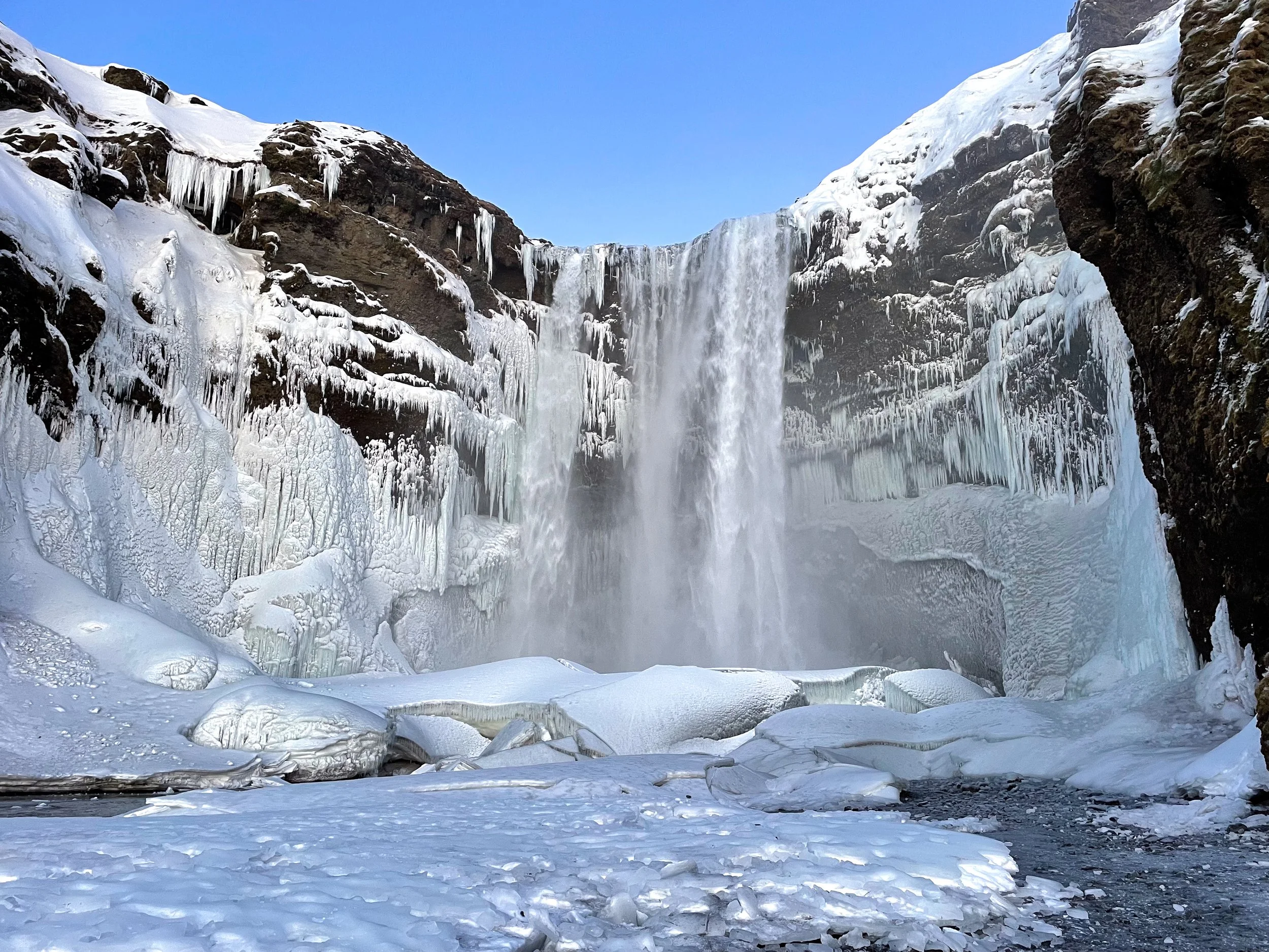 Skogafoss is a grand and picturesque waterfall, both impressive for its height and width. The water seemed to move in slow motion as it fell. It was equally as peaceful as powerful to watch. There is a trail and staircase to an overlook at the top of the falls. It also leads further upstream to several smaller waterfalls. It was closed when we visited due to snow and ice.