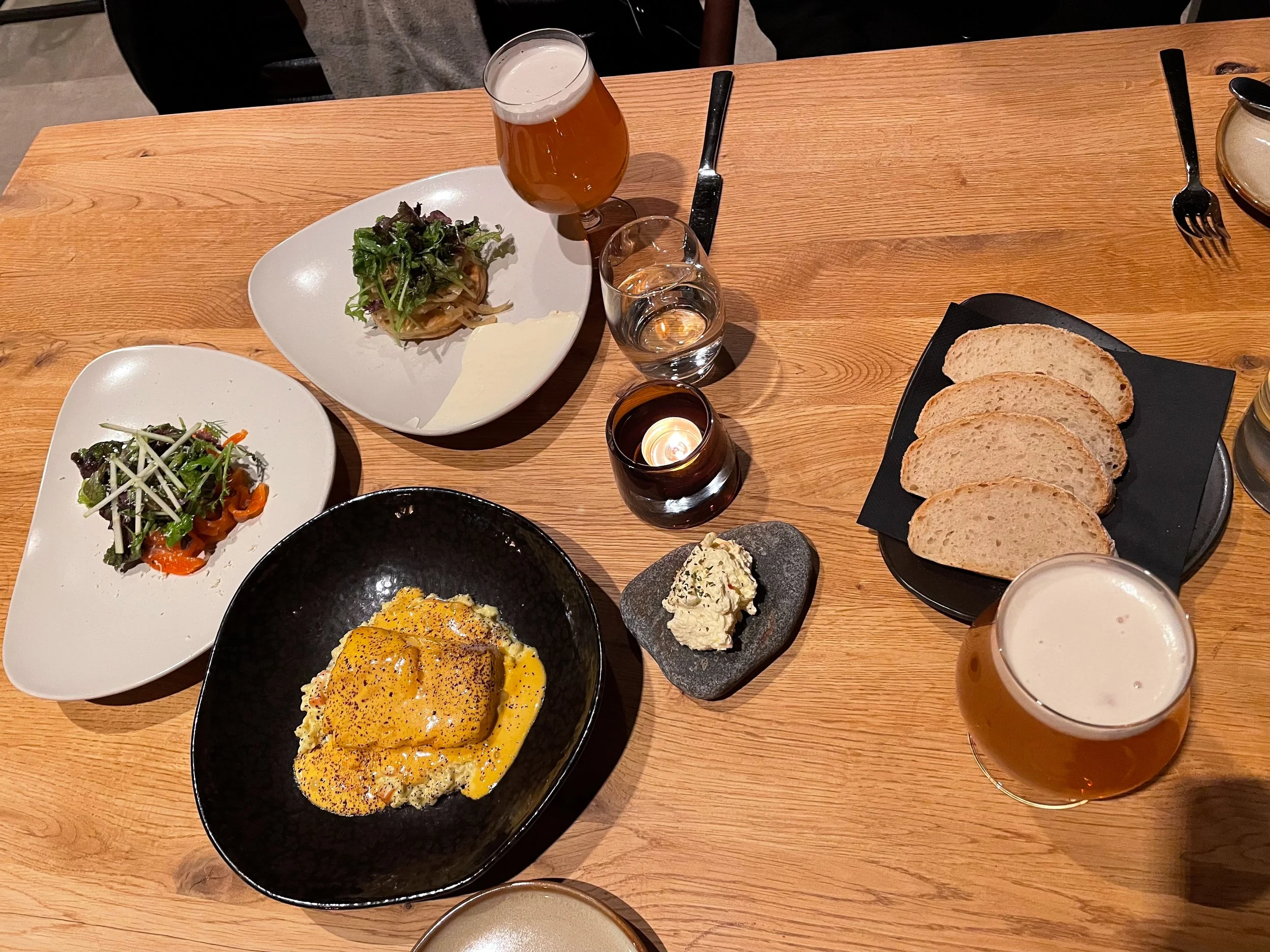 On our return to Hella, we stopped in Vik for dinner at Drangar, a restaurant specializing in modern Icelandic cuisine located at the Kria Hotel. We were welcomed with bread & butter sprinkled with black salt served on a lava rock. We ordered two Gulls and a range of small plates to share: an onion tart, Arctic char tartare, curried cod on a bed of risotto and a poached plum with skyr (Icelandic yogurt).