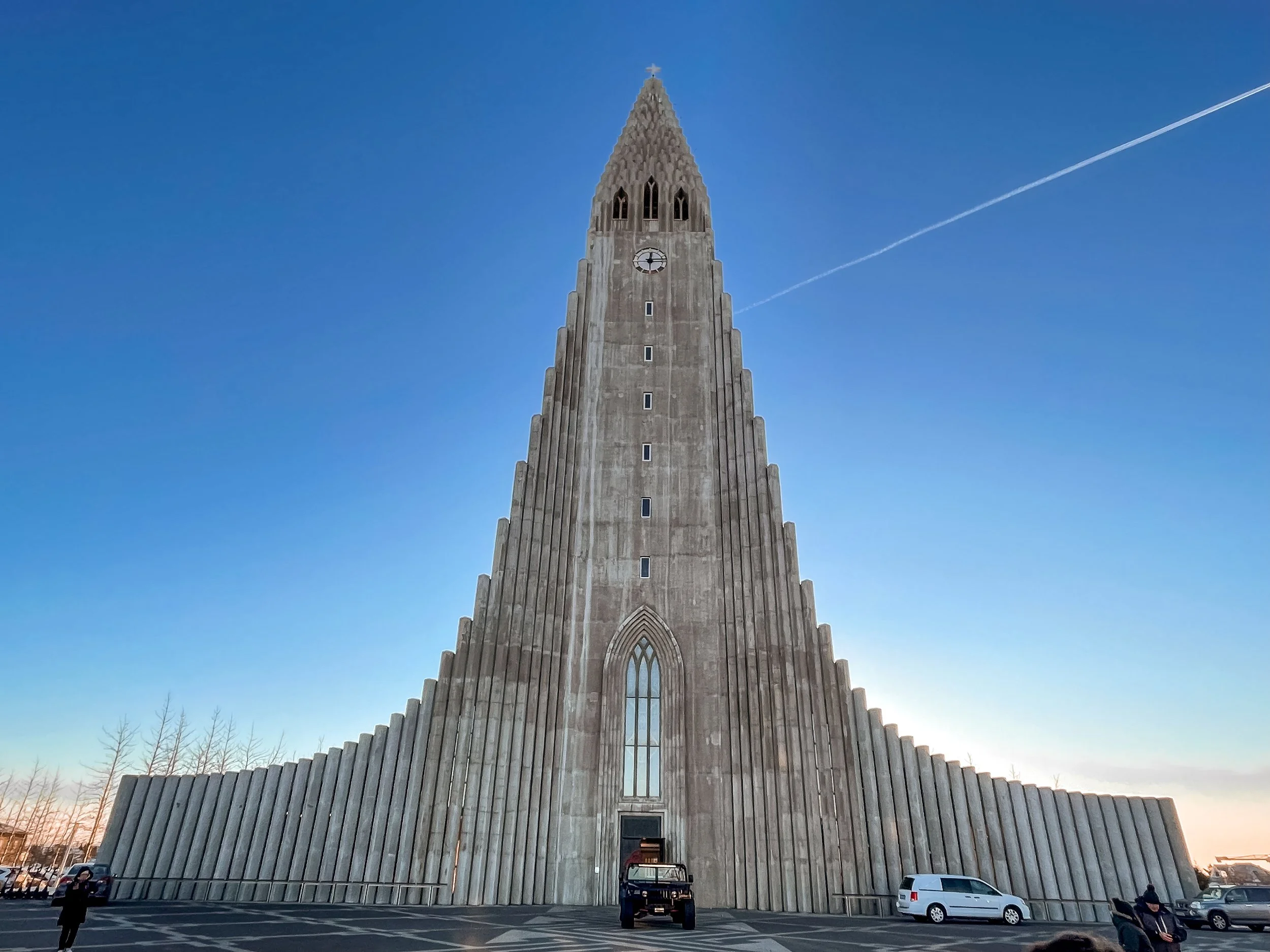 The Hallgrímskirkja Cathedral is a stepped concrete cathedral designed with inspiration from the Icelandic landscape. The shape is meant to resemble an erupting geyser with its facade made from hexagonal columns reminiscent of the basalt columns seen across the country. There is an elevator to the top of the spire which overlooks Reykjavik. It was closed when we visited due to a funeral.