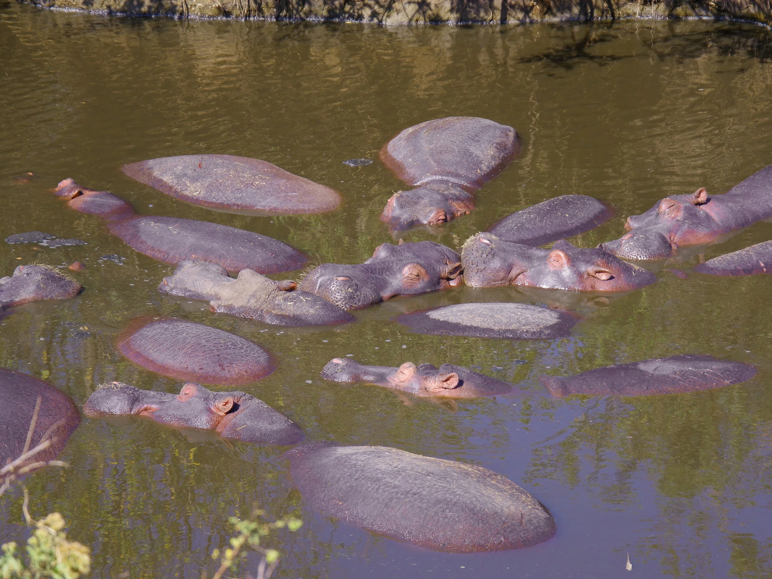 Seronera River. A narrow river flowing through the south eastern Serengeti. Its lush banks are an oasis for Nile crocodile and large families of bathing hippos. Hundreds of hippos soak with their heads and backs above the water, huffing, puffing and snorting after fully submerging. A rare sight was an 8 ft long python slowly slithering across the ground not far from a large crocodile.