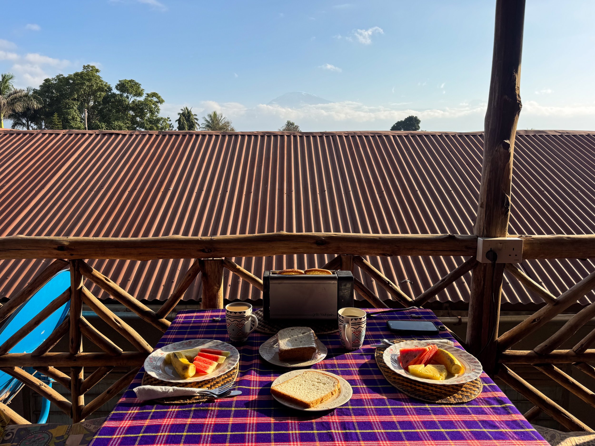 The Belle View Inn Bed and Breakfast. A small hotel with comfortable rooms, daily breakfast, luggage storage and transportation between the airport. We stayed here before and after our hike to Mt. Kilimanjaro. On a clear day, the peak of the mountain is visible from their second floor breakfast hut! Reserve on Booking.