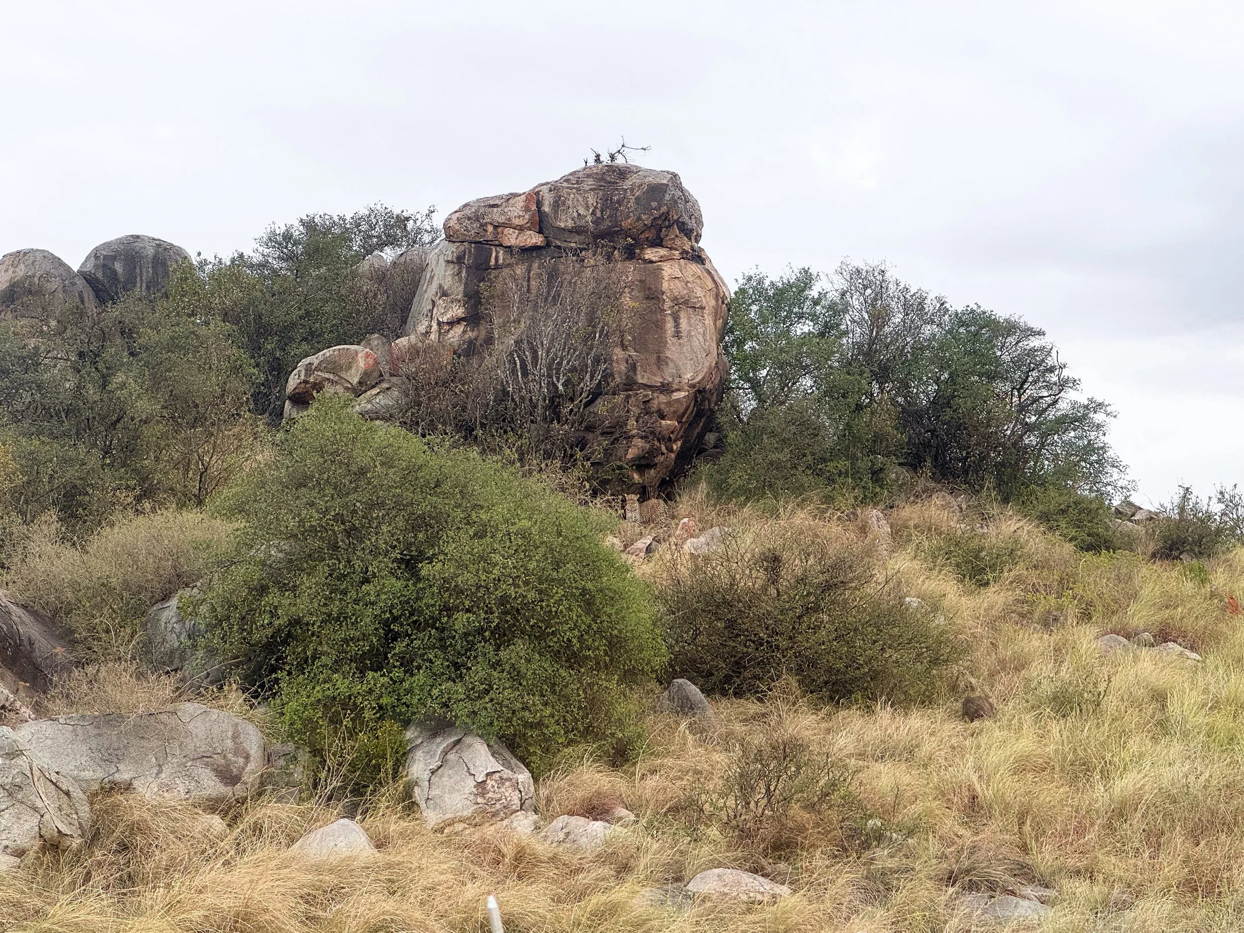Leopards. Leopards are one of the most difficult animals to spot on the savanna. Our guide spotted one, very well camouflaged and perched on a Kopjes. To our surprise, two cute leopard cubs appeared and began licking the larger one before walking off together.
