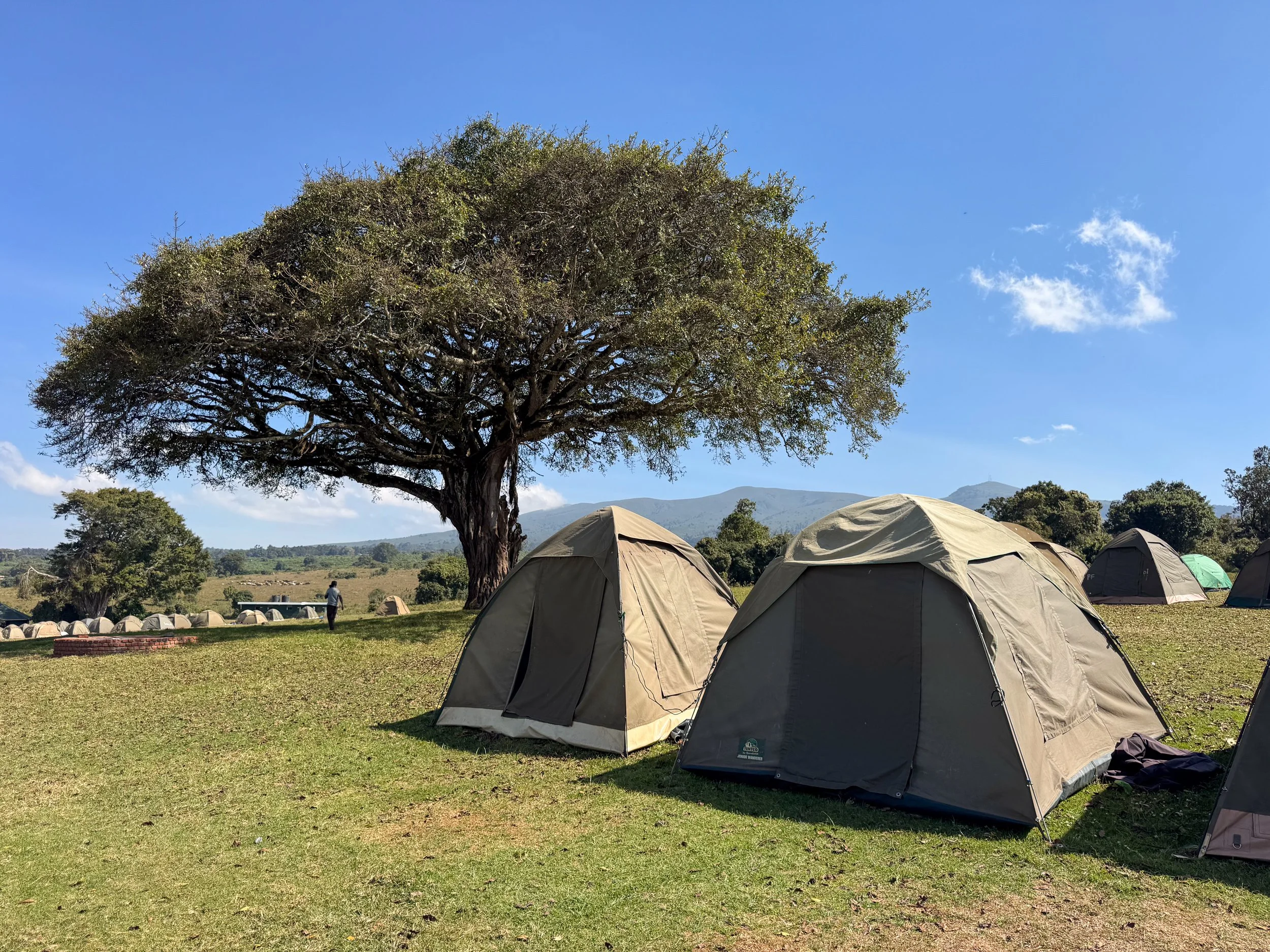 Simba Campsite A. A large campground on the Ngorongoro Crater Rim. It’s popular with both tenters and camper vans, offering amenities like shared kitchens, restrooms, hot showers, fire pits and a camp store. The campsite is surrounded by lush forest home to wild animals. An elephant walked along the camp’s perimeter, a herd of zebra grazed outside of our tents and a tower of giraffes sat across a distant hill.