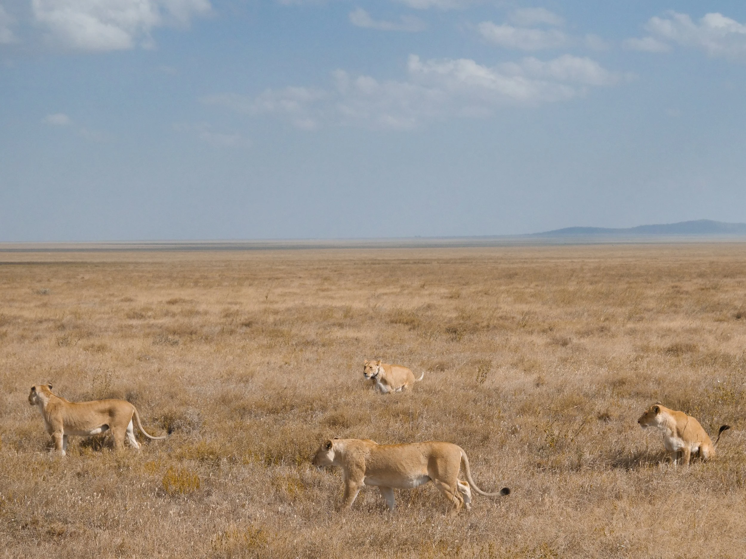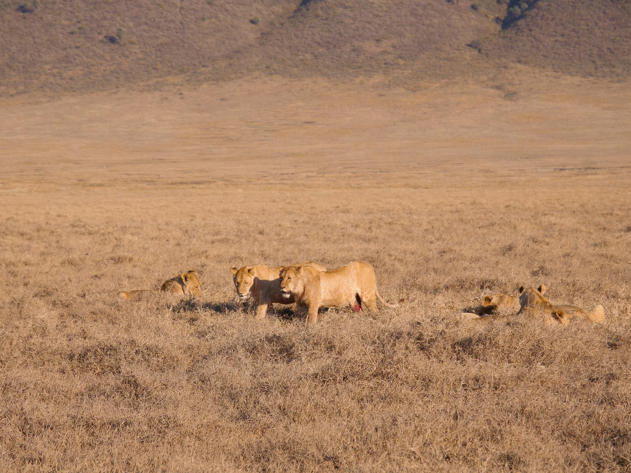 Lions & Cats. Lions are the primary predator in The Ngorongoro Crater. We spotted a lioness and her three cubs walking along the roadside. A very majestic male lion with a dark mane stood in the grasses, looking across the landscape. A little serval slept in the dry grasses and morning sunlight.
