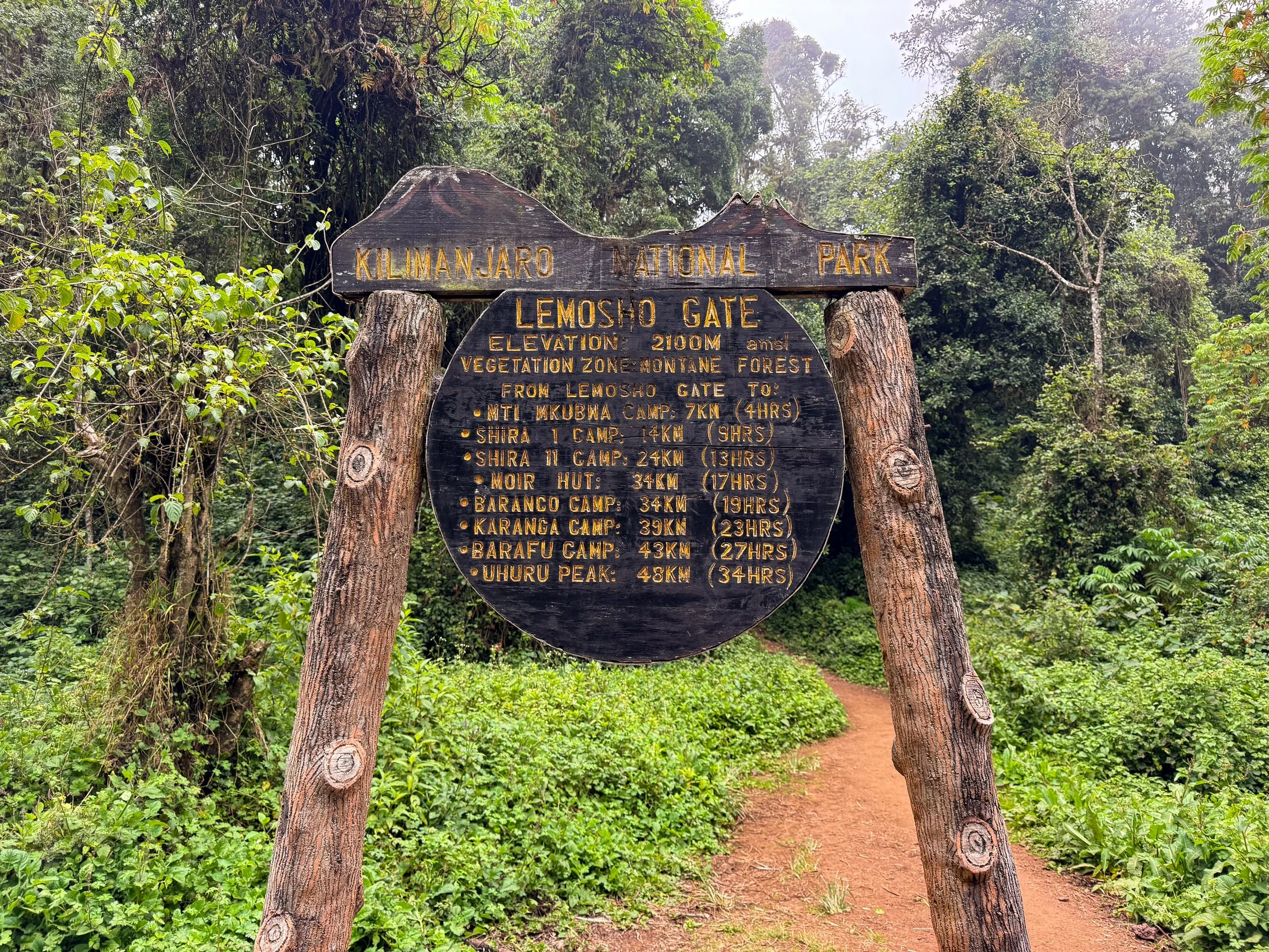 Lemosho Gate. The crew shuttled us to the Lemosho Gate for the official start of our hike. In route, we passed through The Cultivation Zone, one of five climate zones on the mountain, characterized by hilly fields of hardy crops and pine trees. The gate marks the start of the Lemosho Route, beginning at an elevation of 2,100 meters (6,890 feet). The first 7km leads through the Vegetation Zone to the Mti Mkubwa Camp.
