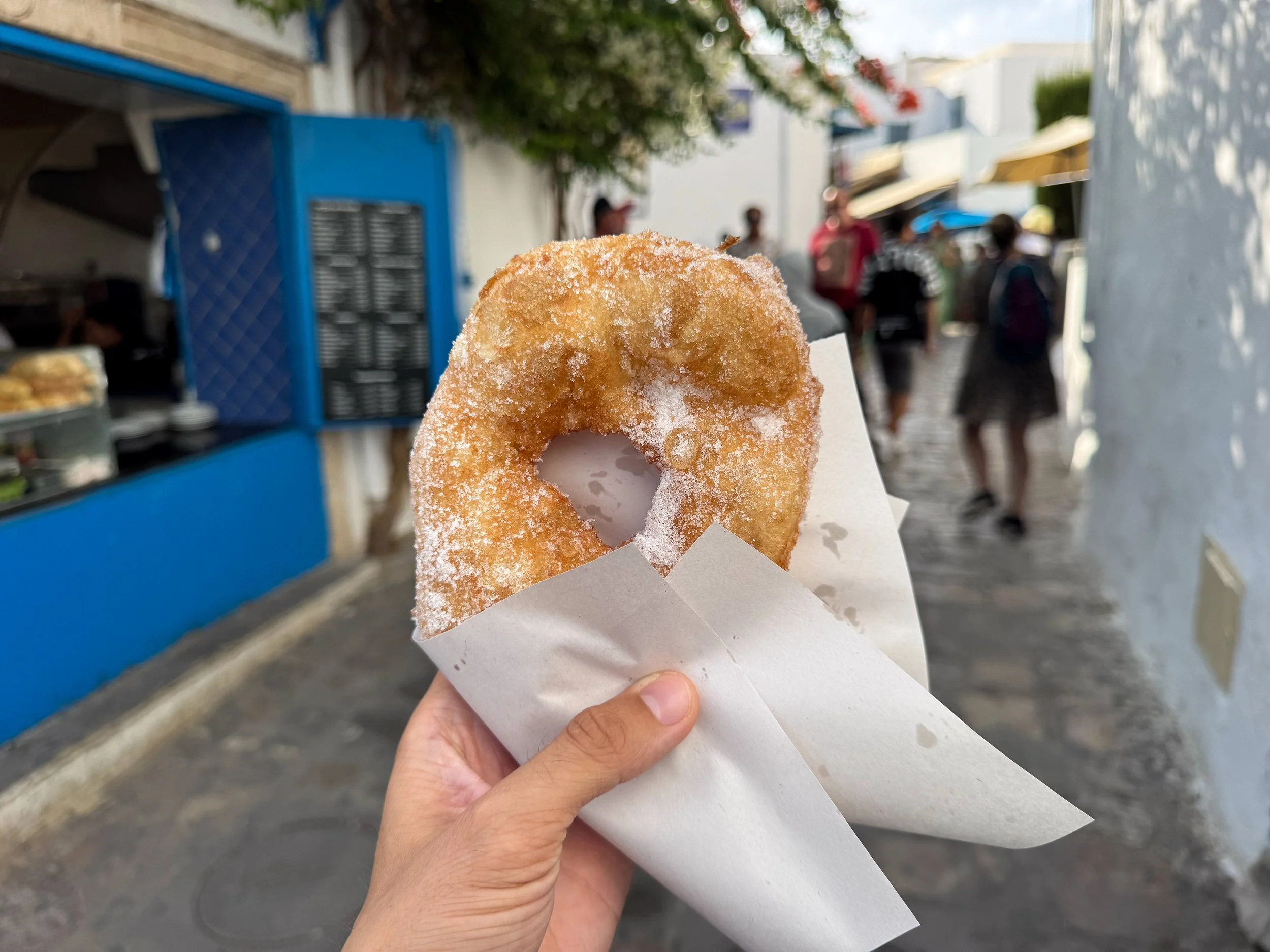 Bambalouni Sidi Bou Said. A street side kitchen frying Bambalouni, Tunisian donuts dusted in sugar. They almost obligatory when walking through town.