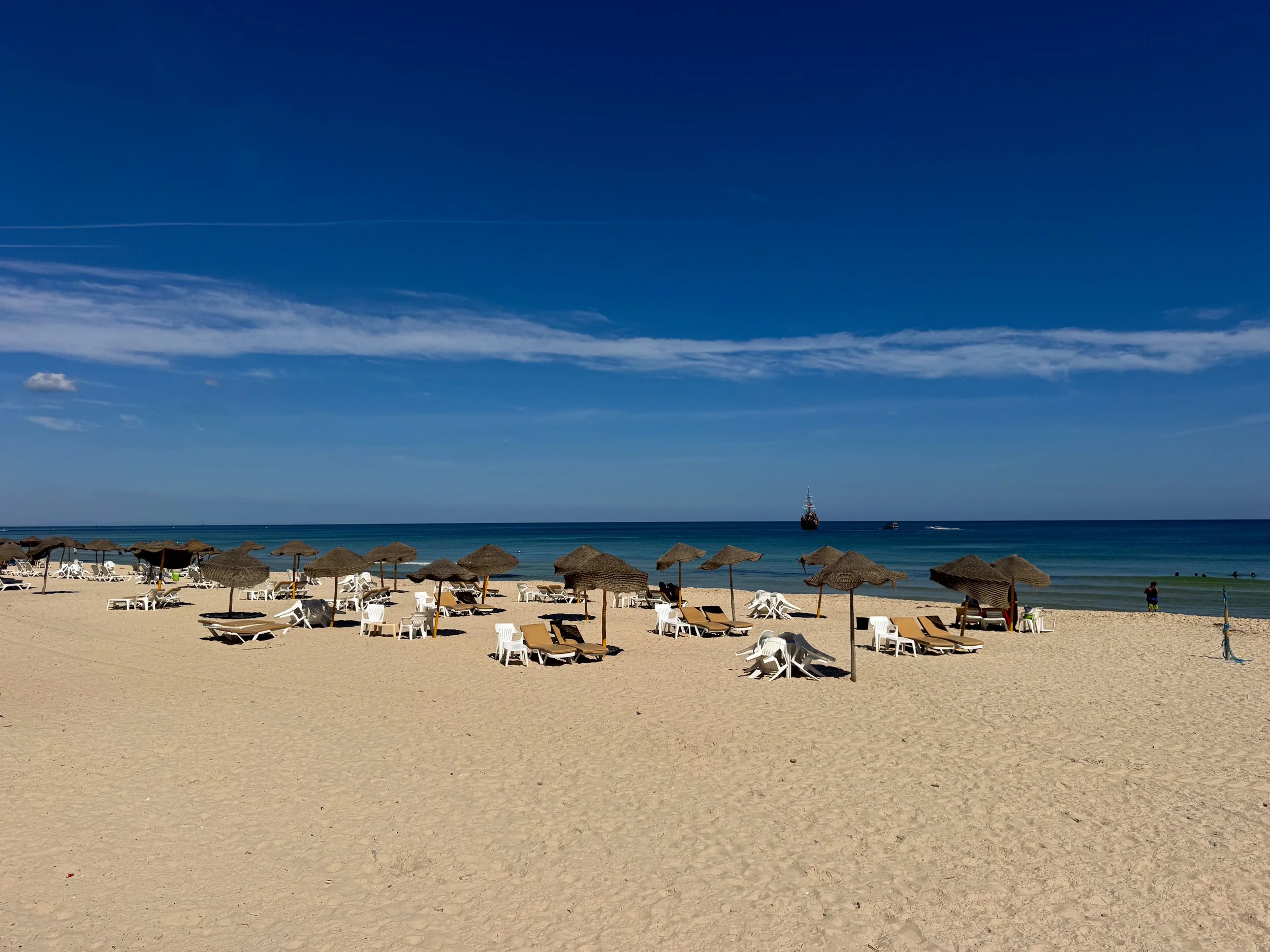 Bou Jaafar Beach. A white sand beach with a seaside promenade. It’s the closest beach to the Medina yet sparsely visited. There are a couple spots to rent umbrellas and beach lounges.