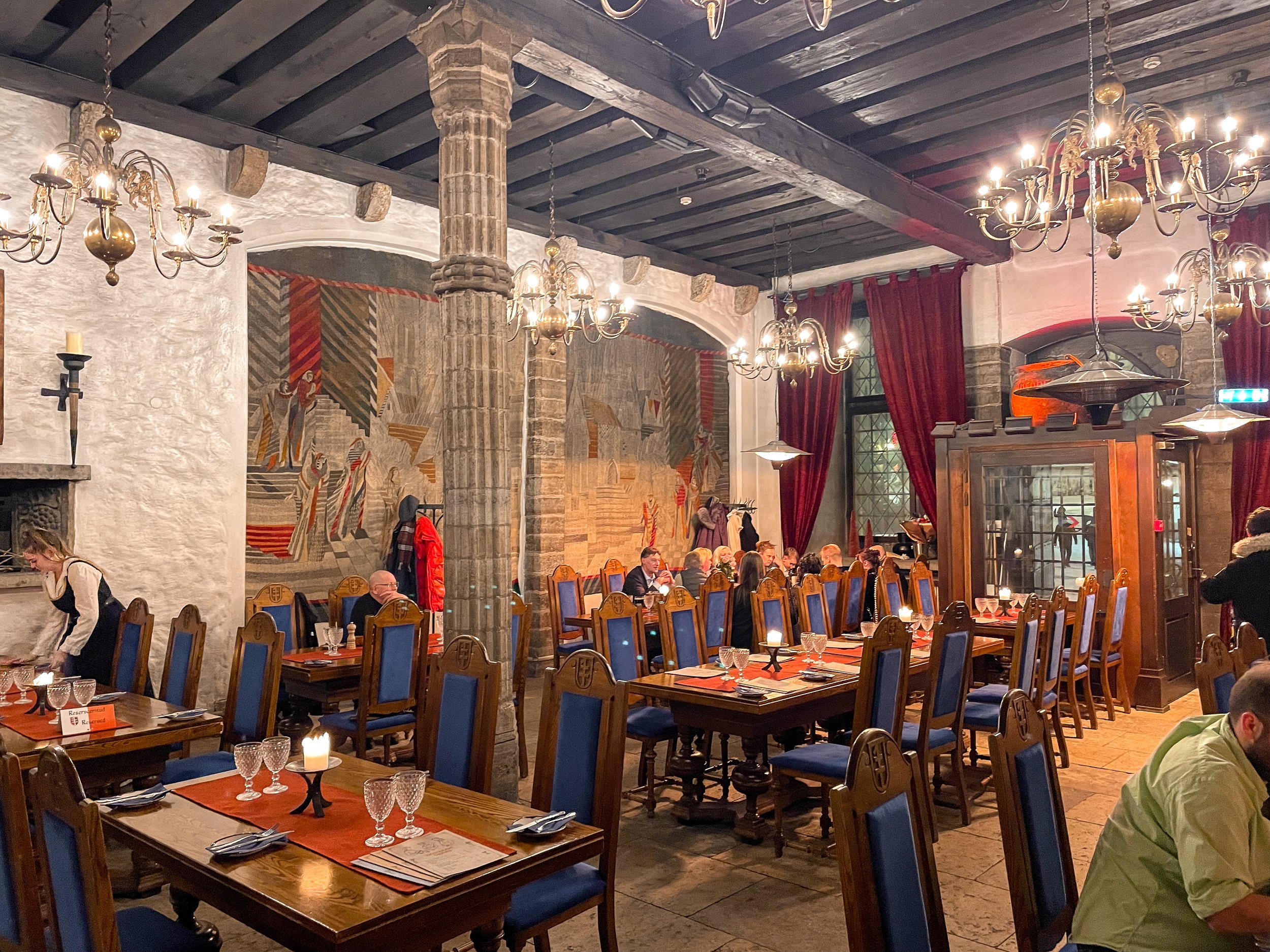 Olde Hansa. Set within a 14th century merchant house, this restaurant offers a medieval atmosphere with its candlelit interior, carved furnishings, illustrated decor, piper music and costumed staff. Its extensive menu features hearty dishes and tasting courses with smoked game, exotic meats, cured fish, braised vegetables and herbed breads, complemented by spiced wines, flavored beers and infused schnapps. Order the forest mushroom soup, oven baked juniper cheese and the Neptune fish platter along with a goblet of herbal or cinnamon beer and caraway schnapps. The food and ambiance struck the perfect balance of theme and authenticity without being gimmicky. Most importantly, everything tasted delicious!