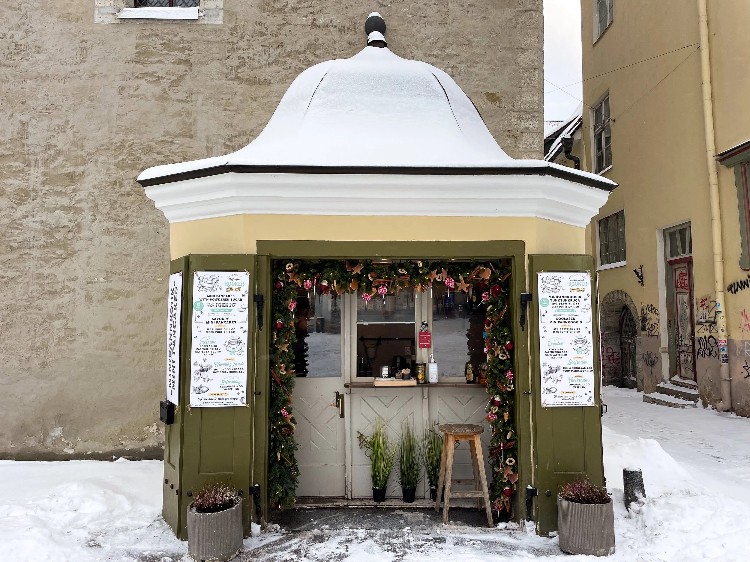 Kooker Raekoja Plats. A small street side counter serving mini grilled pancakes and hot beverages in edible cups. Try them topped with raspberry jam and sweetened condensed milk.