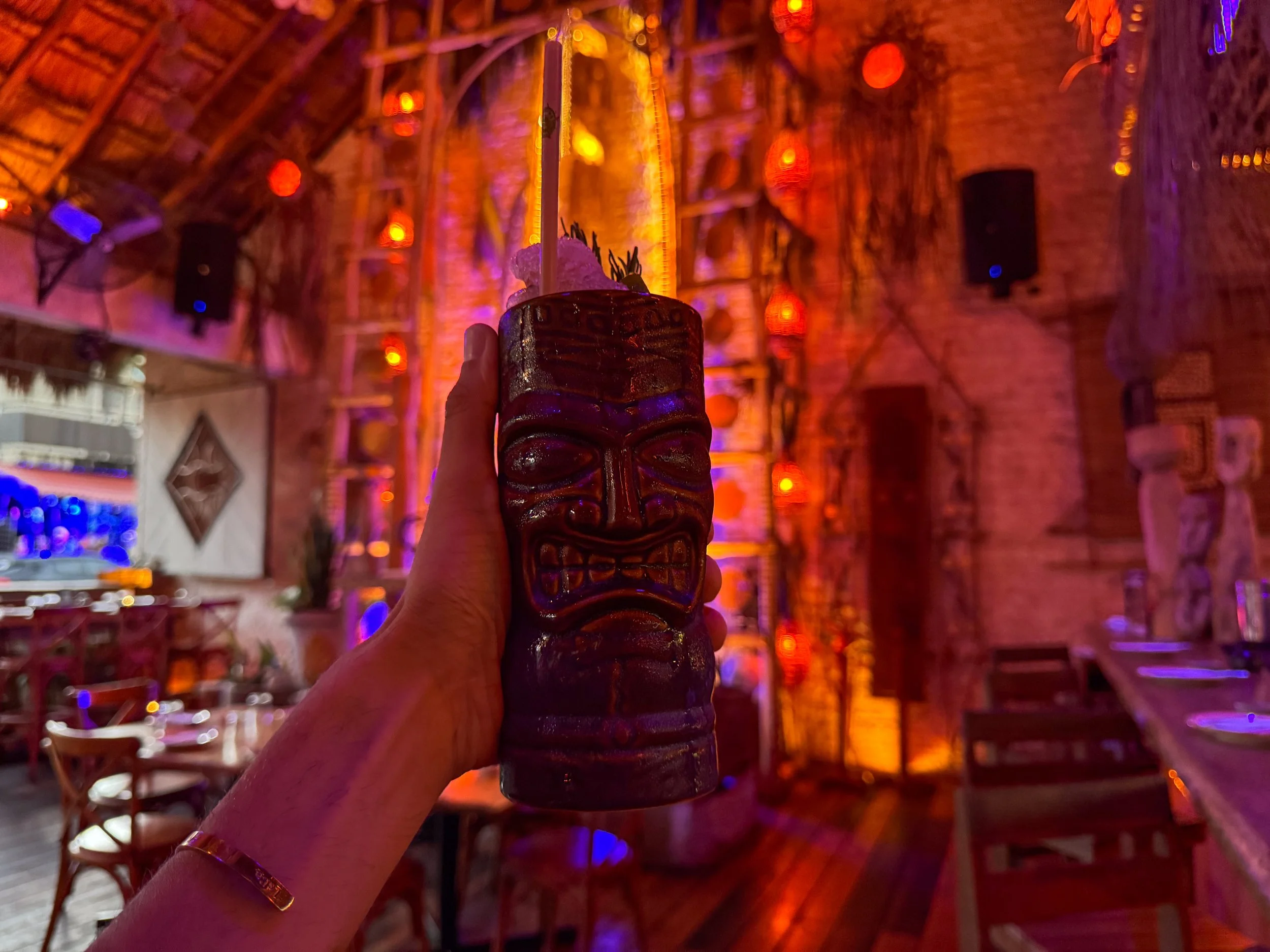 Fruta Bar Bacalar. A cocktail bar merging Mexican and Caribbean flavors in a warm and natural space decorated with warm lights, dim candles, tropical plants, dried palm fronds and wooden furniture. It’s connected to a sushi restaurant. We ordered the Spicy Love and The Tiki.