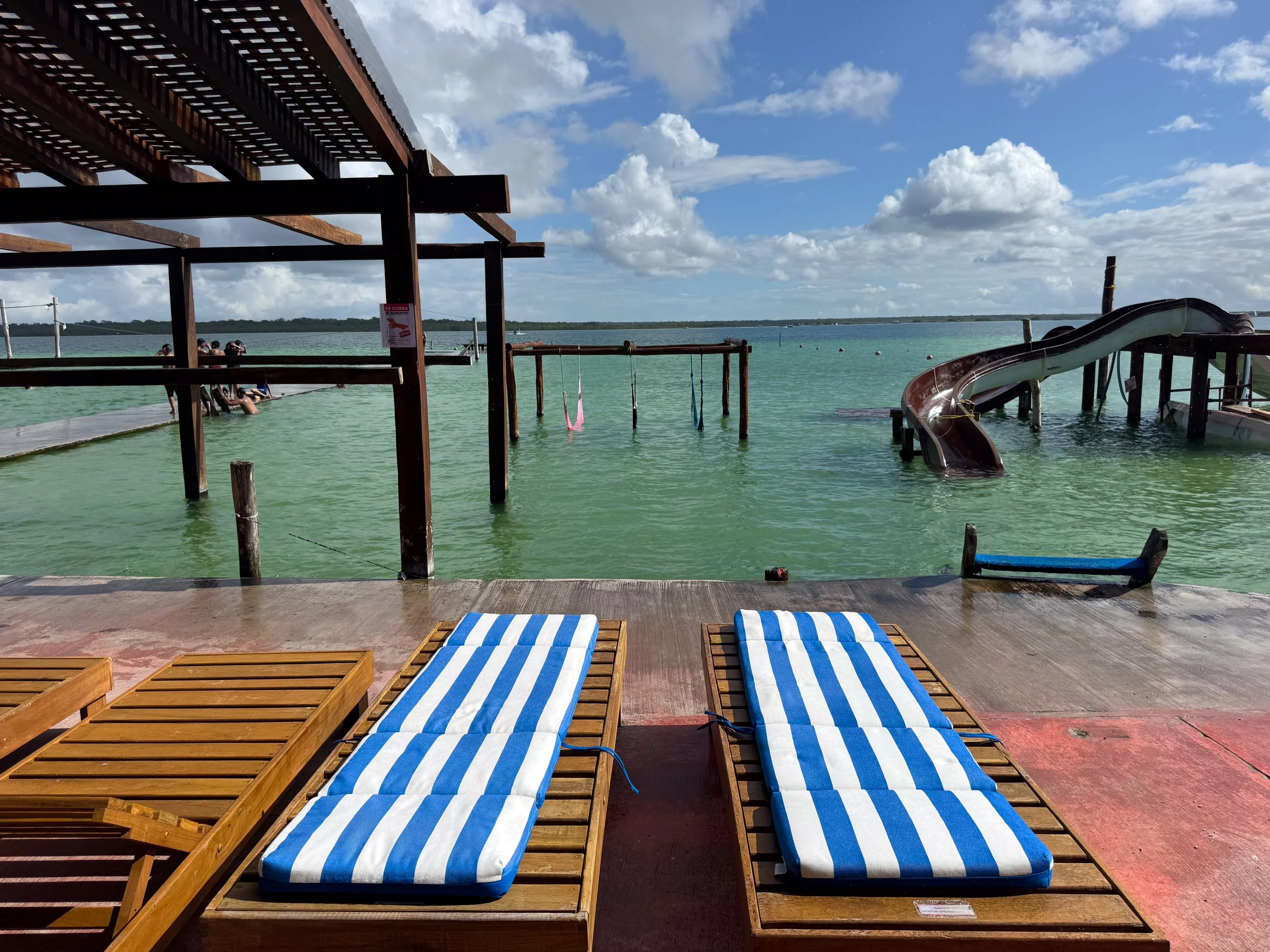 Balneario Ejidal Mágico Bacalar is a “lagoon club” mostly popular with locals. We bought a day pass and rented sun lounges overlooking the lagoon while sipping on Mexican cerveza. Families of locals picnicked under the thatched picnic tables, children slid down small waterslide, people jumped off docks into the lagoon while others lounged in overwater hammocks.