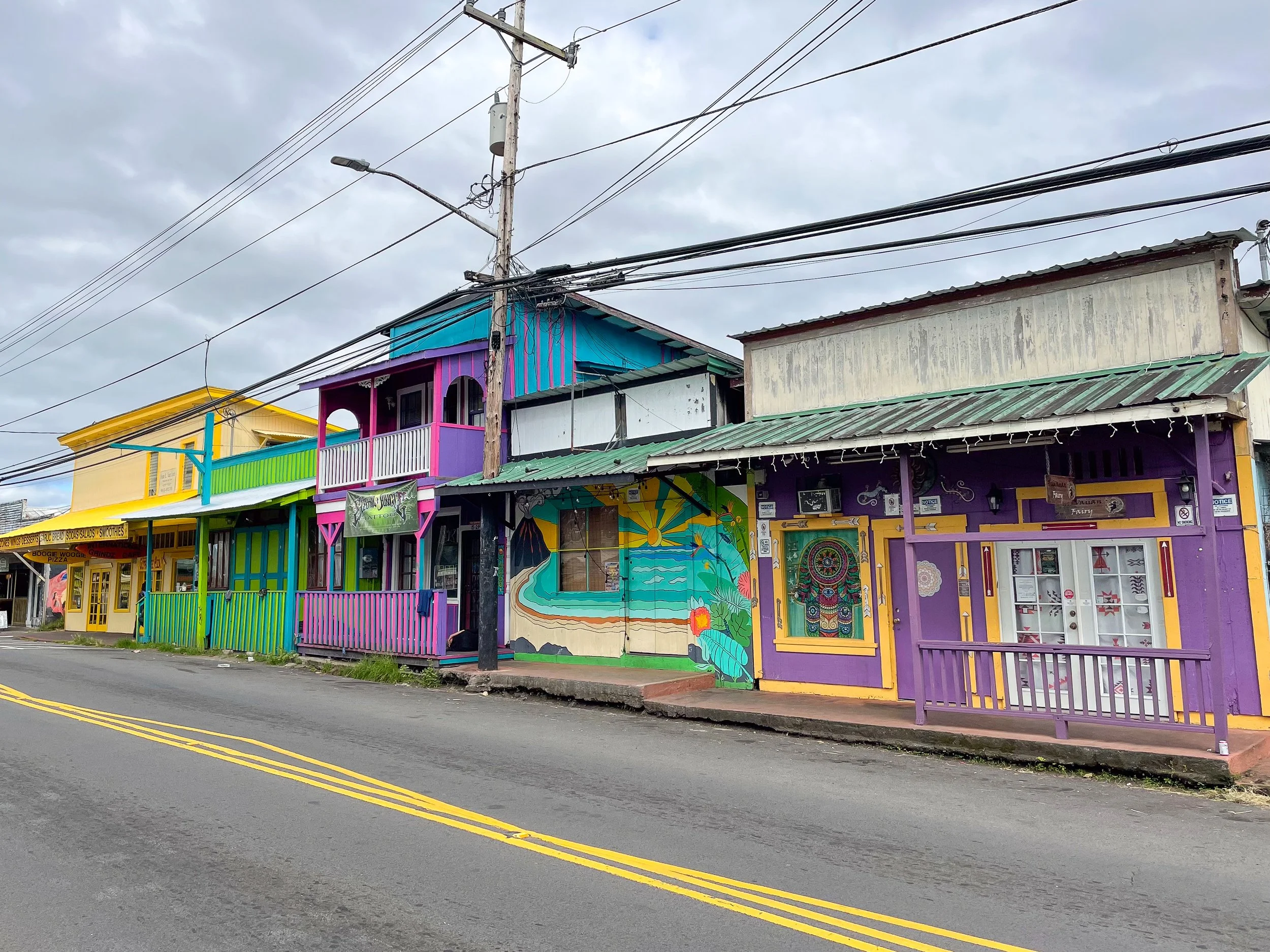 A small town with hippie vibes, colorful wooden buildings and an old boardwalk with restaurants, craft stores and galleries. It’s located nearby public black sand beaches and hardened lava fields. The town is 30 minutes south of Hilo. Many hitchhikers and skateboarders congregate around here.