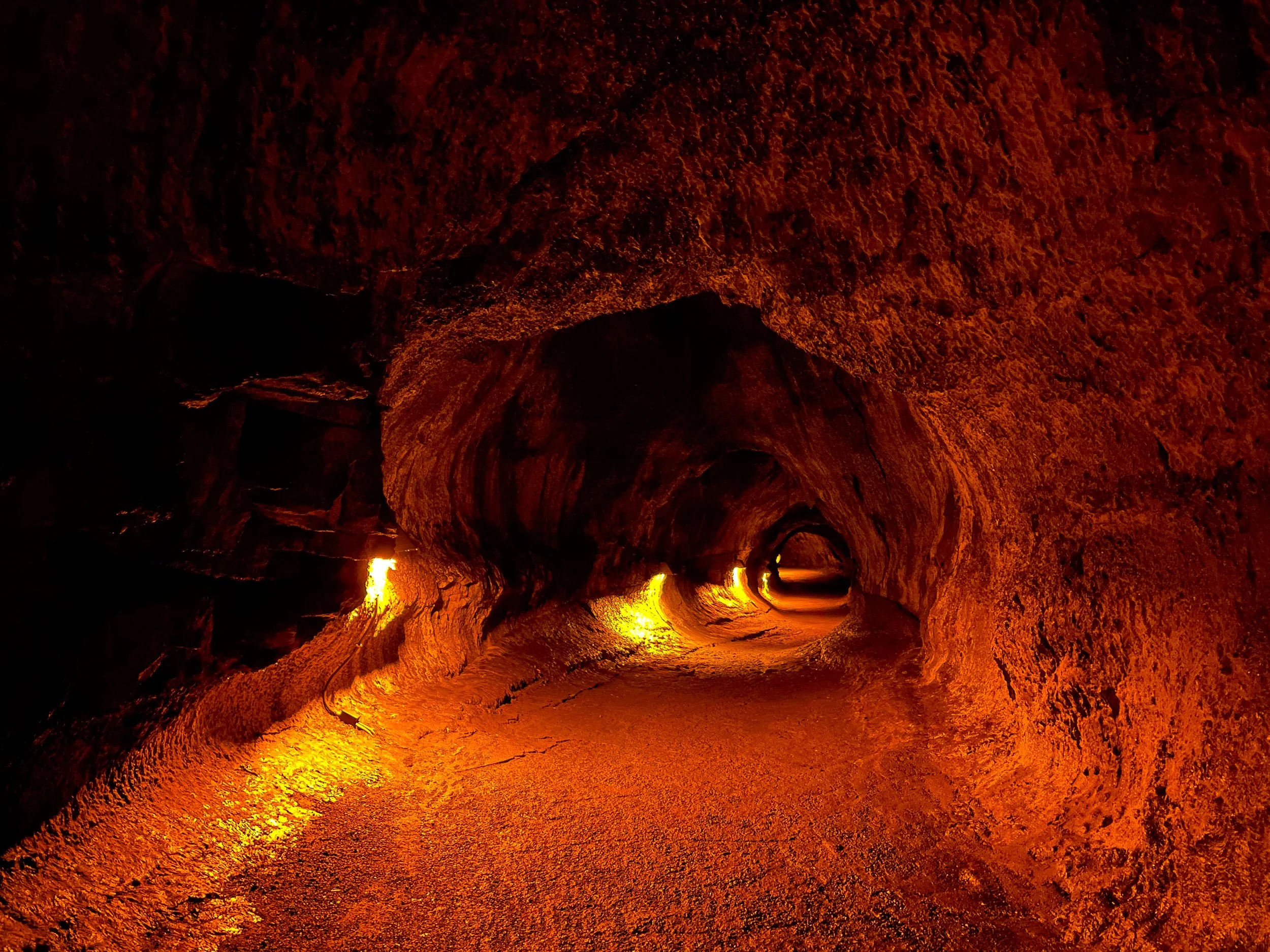 Thurston Lava Tube. An ancient lava tube in a tropical fern forest. A trail leads hundreds of feet inside. It’s open 24 hours a day however its amber hued lights are only on from 8am - 8pm. The lava tube is accessible after a 5 minute walk from the Kīlauea Iki parking lot.