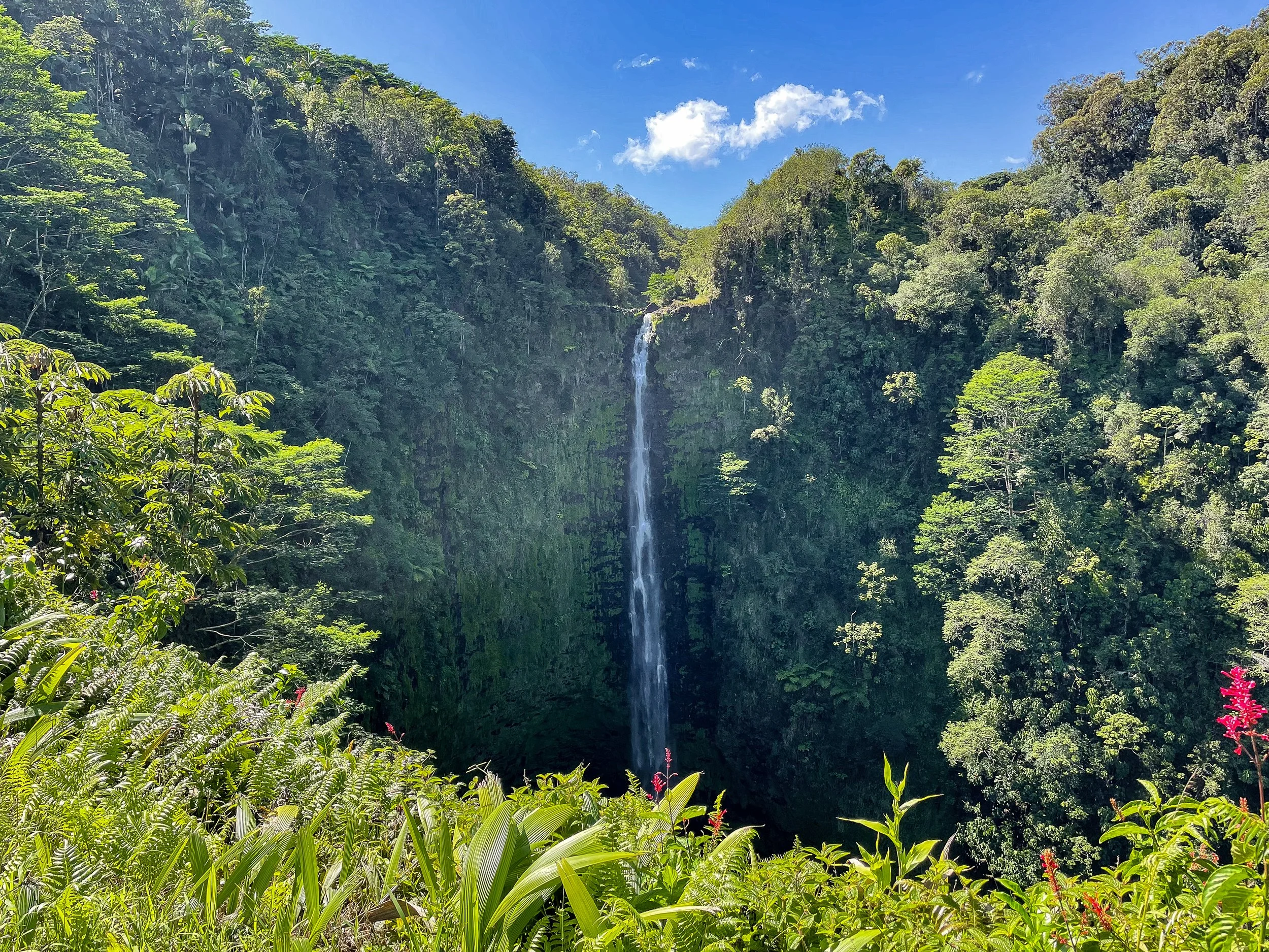 Akaka Falls. A 442ft tall waterfall spilling down the center of a mossy cliff within the lush tropical forest. It’s accessible by a paved trail that loops through the forest with an overlook. There is a fee to enter the trail and to park in the parking lot.